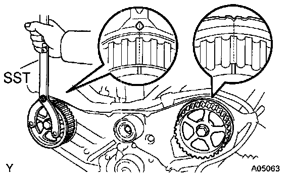 Using SST, turn the camshaft pulley, align the timing marks of the timing pulley and No.3 timing belt cover.