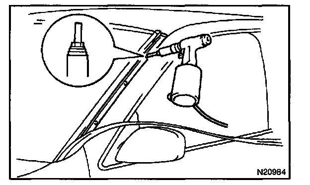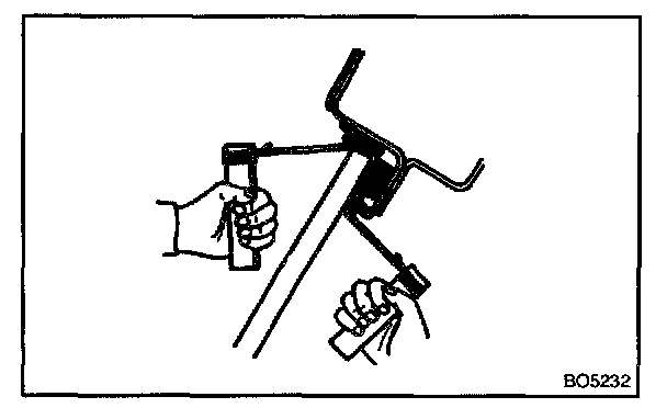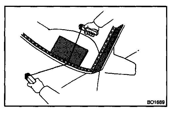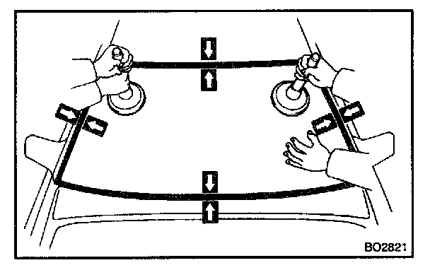 NOTE: When separating the glass, be careful not to damage the paint and interior and exterior ornaments. To prevent scratching the safety pad when removing the windshield, place a plastic sheet between the piano wire and safety pad.