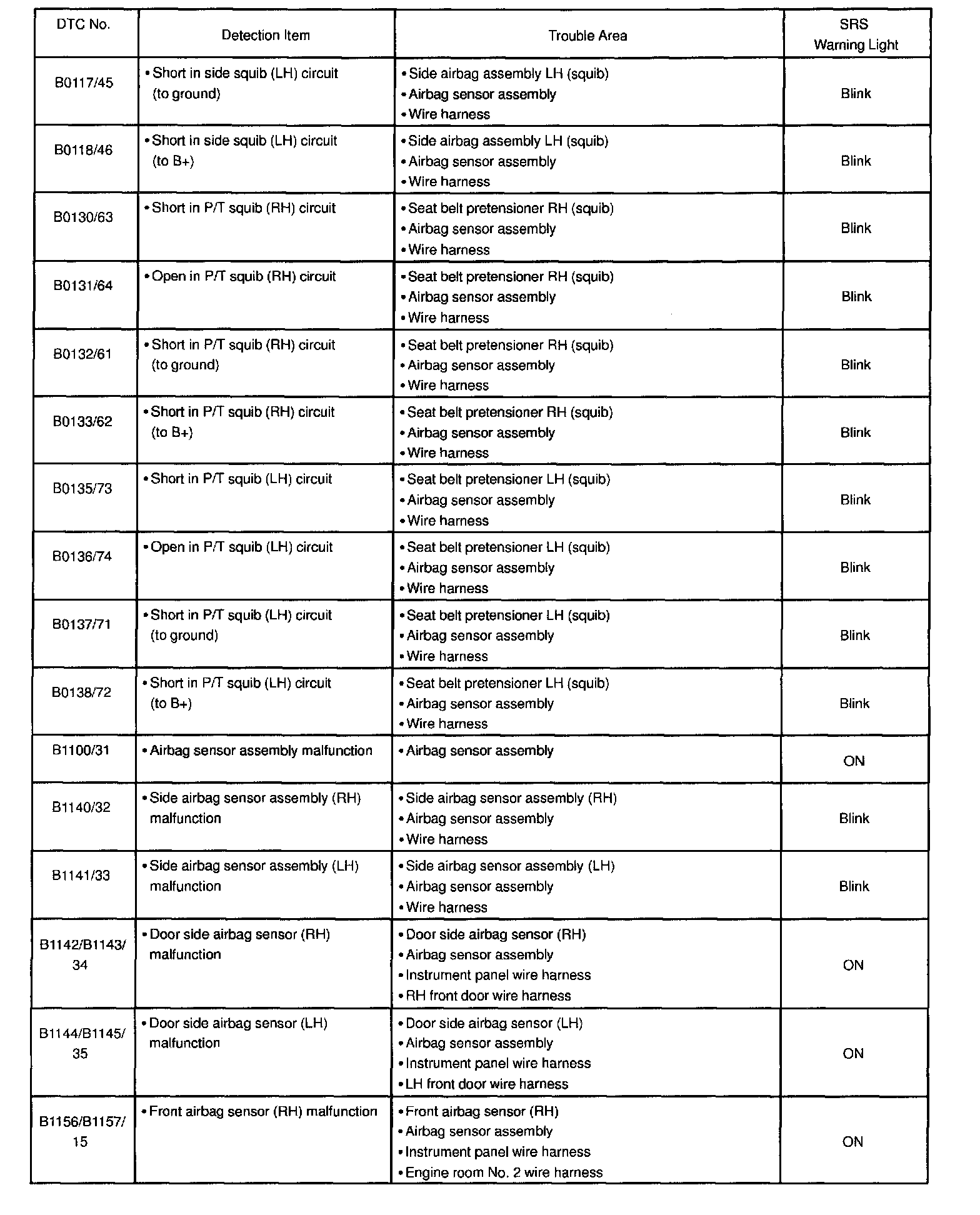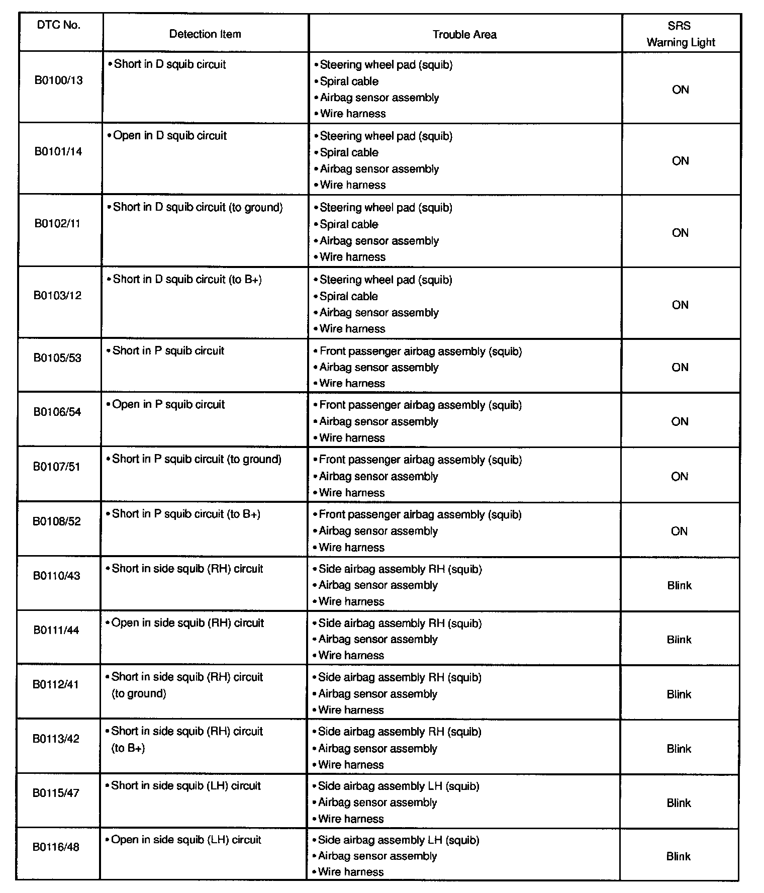 DIAGNOSTIC TROUBLE CODE CHARTB0100/13 - B0116/48: