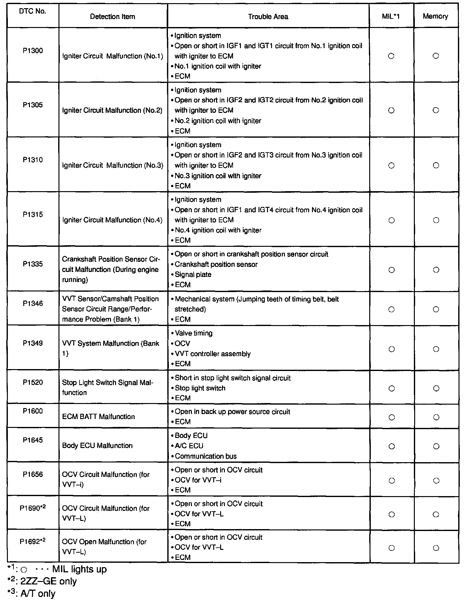 If a malfunction code is displayed during the DTC check in check mode, check the circuit for that code listed in the table. For details of each code, refer to the respective "DTC No." under "Trouble Code Diagnostic Procedures". Diagnostic Trouble Code Descriptions