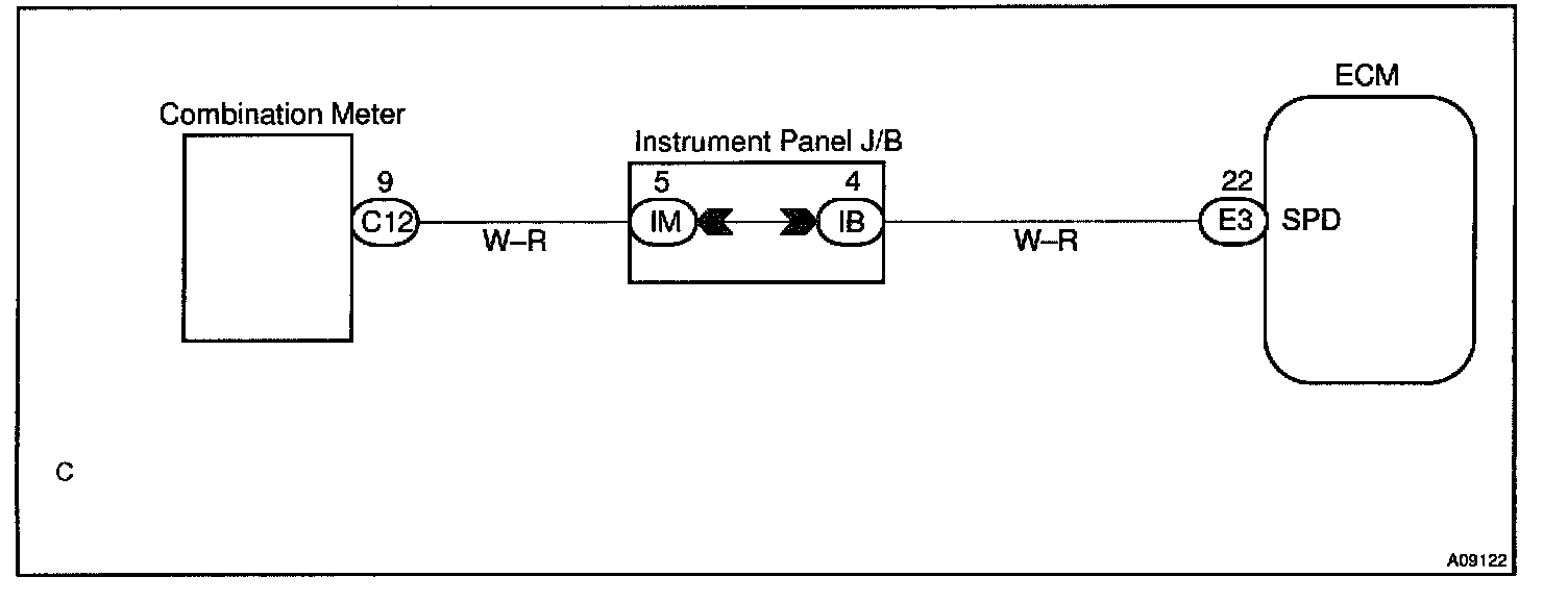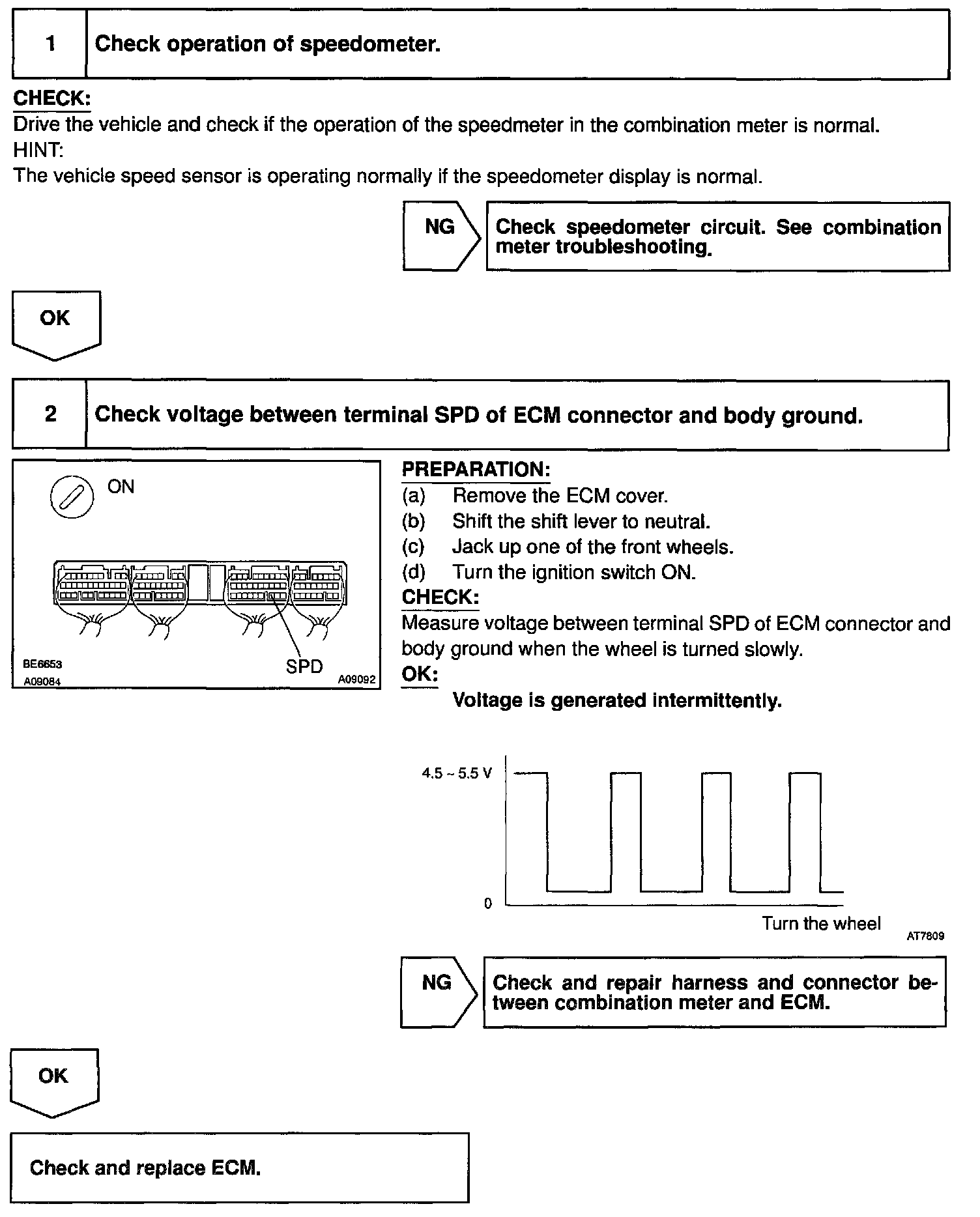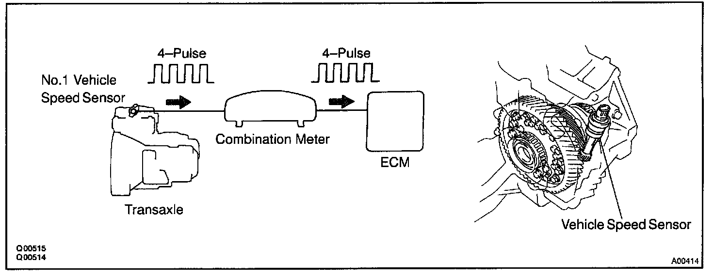 The No.1 vehicle speed sensor outputs a 4-pulse signal for every revolution of the rotor shaft, which is rotated by the transmission output shaft via the driven gear. After this signal is converted into a more precise rectangular waveform by the waveform shaping circuit inside the combination meter, it is then transmitted to the ECM. The ECM determines the vehicle speed based on the frequency of these pulse signals.