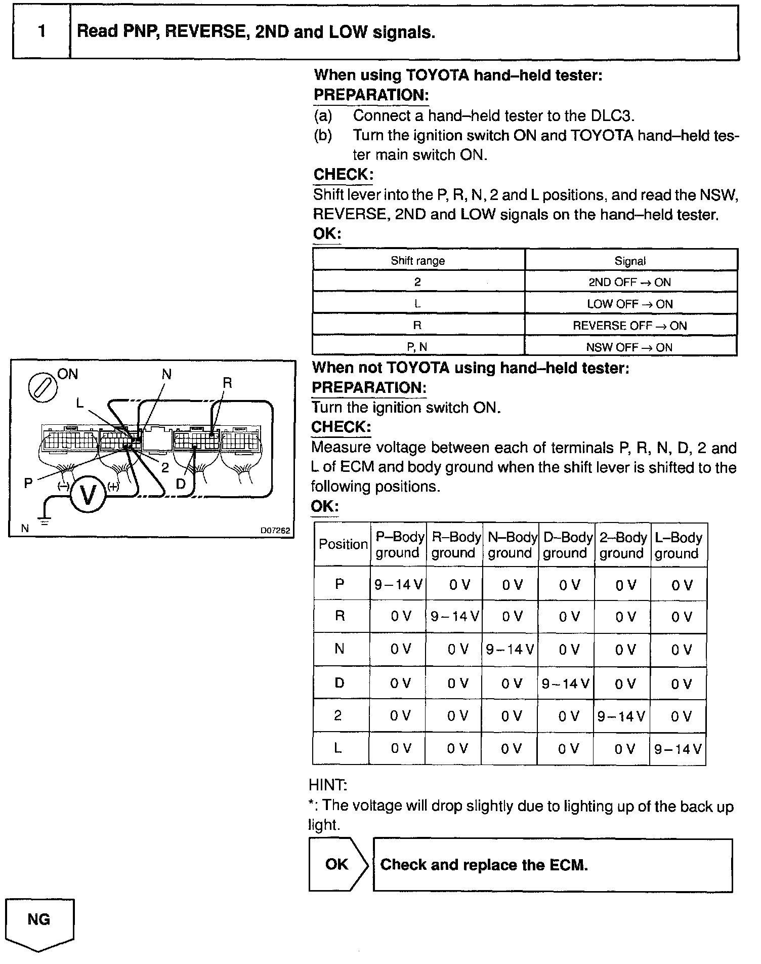 HINT: After confirming DTC P1780, use the TOYOTA hand-held tester to confirm the PNP switch signal from "CURRENT DATA".