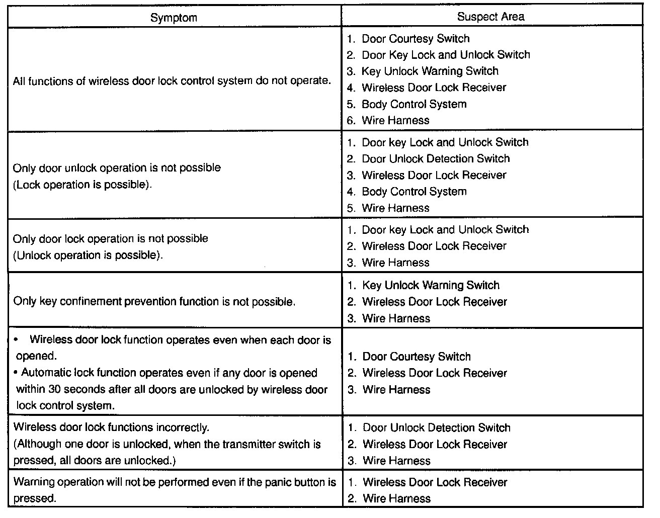 - Troubleshooting of the wireless door lock control system is based on the premise that the door lock control system, power slide door control system and theft deterrent system are operating normally. Accordingly, before troubleshooting the wireless door lock control system, first make certain that the door lock control system, power slide door control system and theft deterrent system are operating normally.