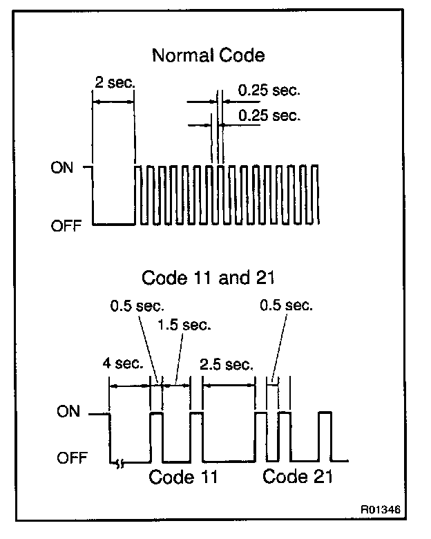 - As an example, the blinking patterns for normal code and codes 11 and 21 are shown on the left.