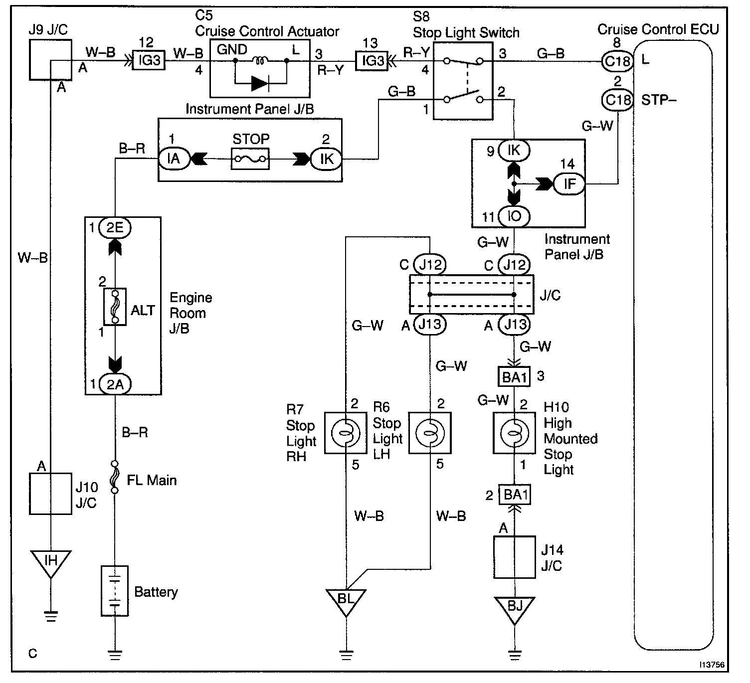 The cancel conditions are: Battery positive voltage at terminal STP- When the brake is ON, battery positive voltage normally is applied through the STOP fuse and stop light switch to terminal STP- of the ECU, and the ECU turns the cruise control OFF. If the harness connected to terminal STP- has an open circuit, terminal STP- will have battery positive voltage and the cruise control will be turned OFF.