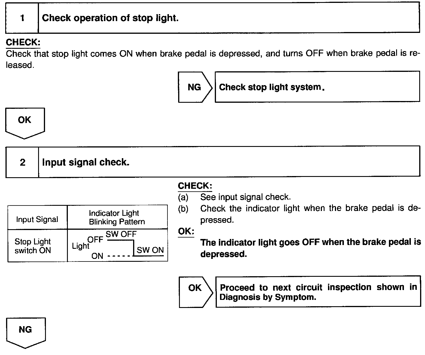 CIRCUIT DESCRIPTIONWhen the brake pedal is depressed, the stop light switch sends a signal to the ECU. When the ECU receives this signal, it cancels the cruise control.