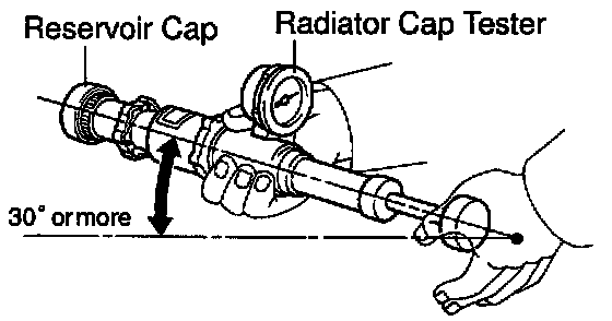 ^ When performing steps a and b, keep the radiator cap tester at an angle of over 30° above the horizontal.