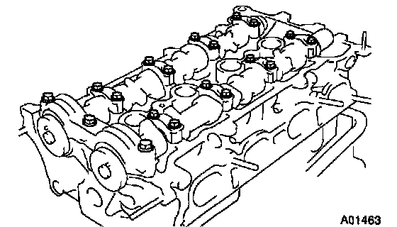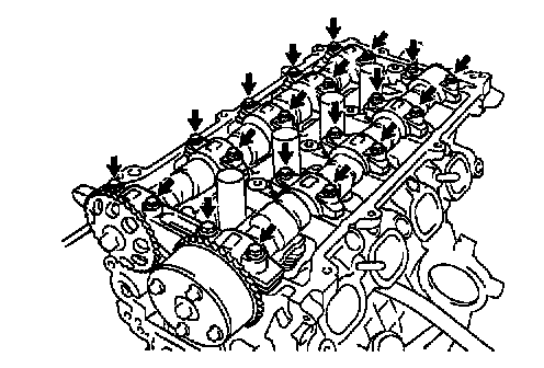 Uniformly loosen and remove the 20 bearing cap bolts, in several passes, in the sequence shown, and remove the 9 bearing caps intake and exhaust camshaft.
