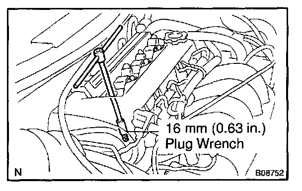 b. Using a 16 mm (0.63 in.) plug wrench, remove the spark plugs.