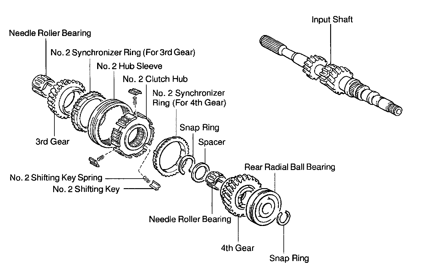 4. REMOVE REAR RADIAL BALL BEARING, 4TH GEAR, NEEDLE ROLLER BEARING, SPACER AND NO. 2 SYNCHRONIZER RING (FOR 4TH GEAR) FROM INPUT SHAFT