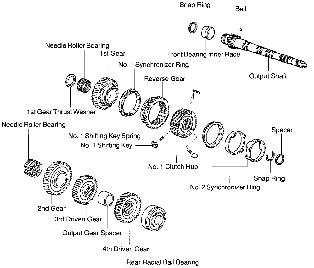 3. REMOVE REAR RADIAL BALL BEARING, 4TH DRIVEN GEAR AND OUTPUT GEAR SPACER FROM OUTPUT SHAFT