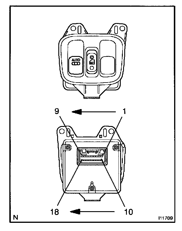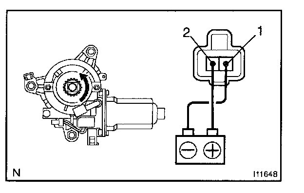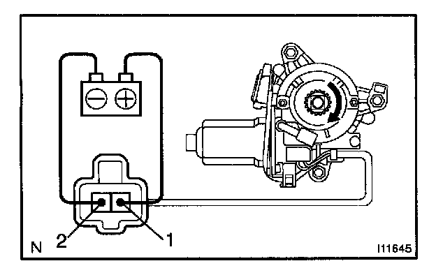 f. Approximately 90 seconds later, connect the positive (+) lead from the battery to terminal 1 and negative (-) lead to terminal 2, check that the window begins to descend.