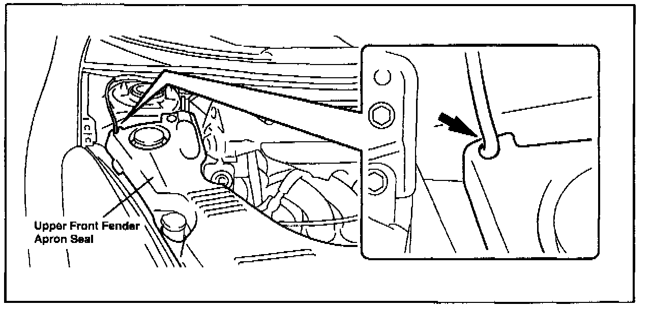 During a repair involving the removal and reinstallation of the upper front fender apron seal, take care not to pinch the washer hose when closing the hood.