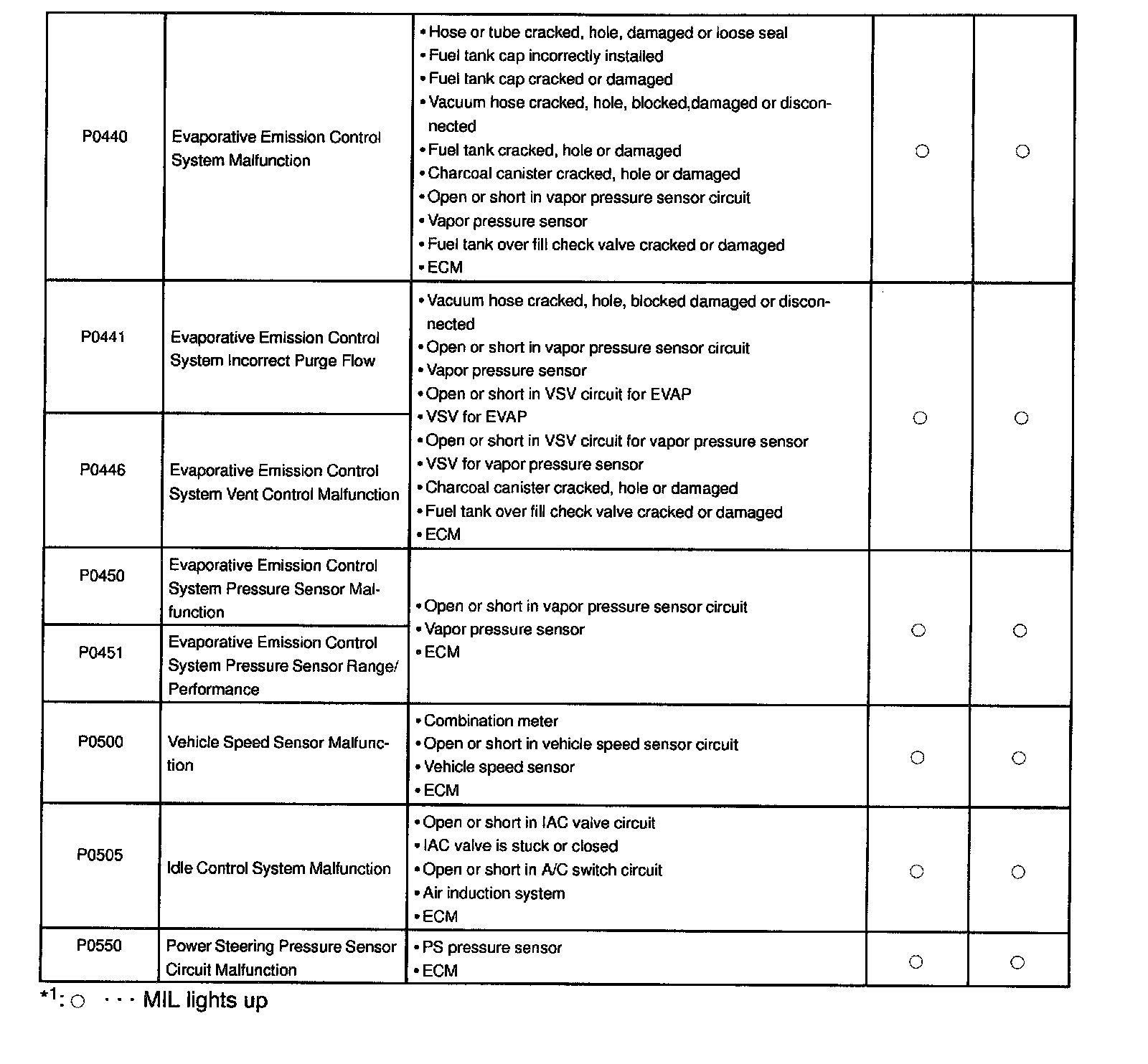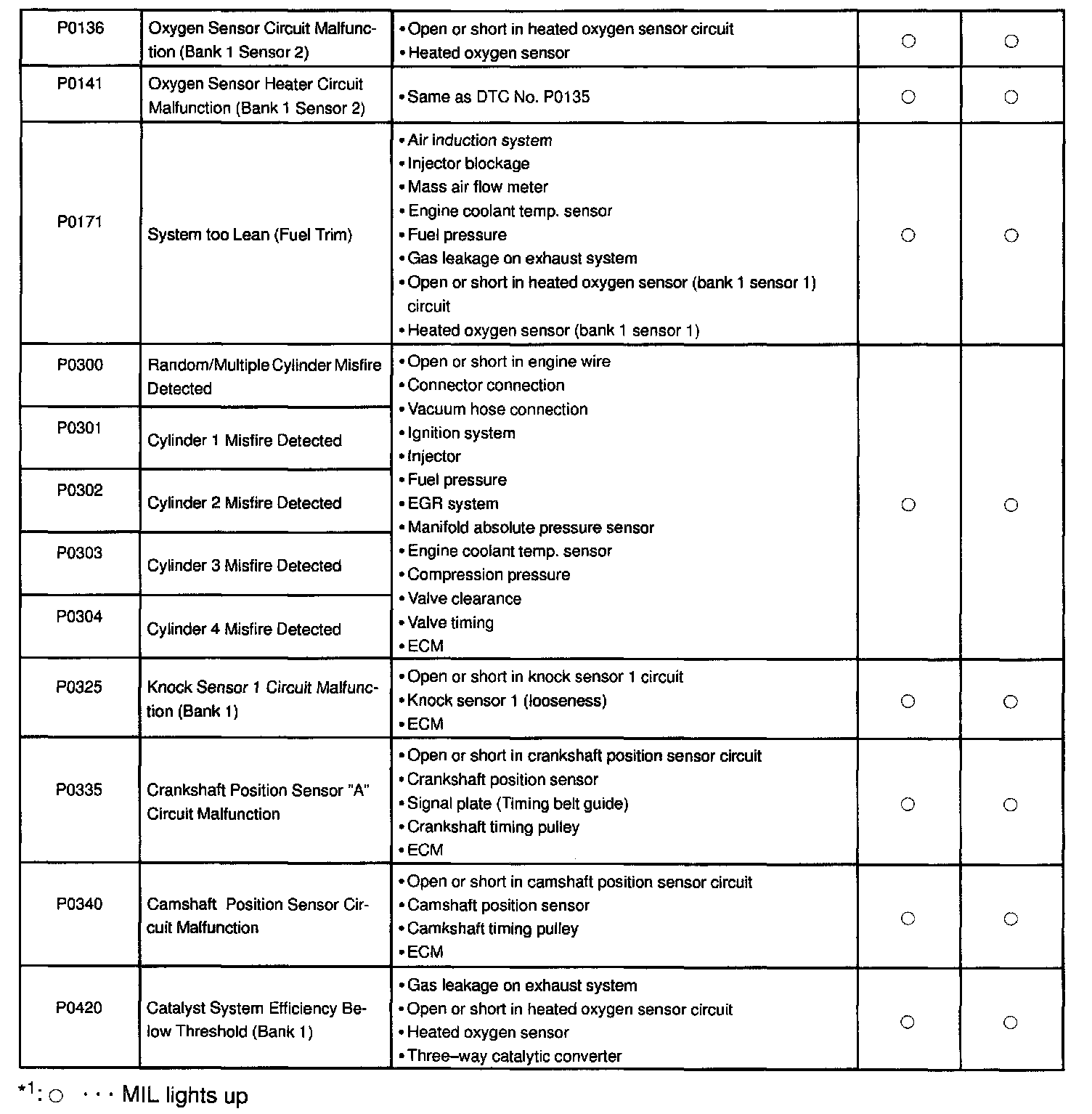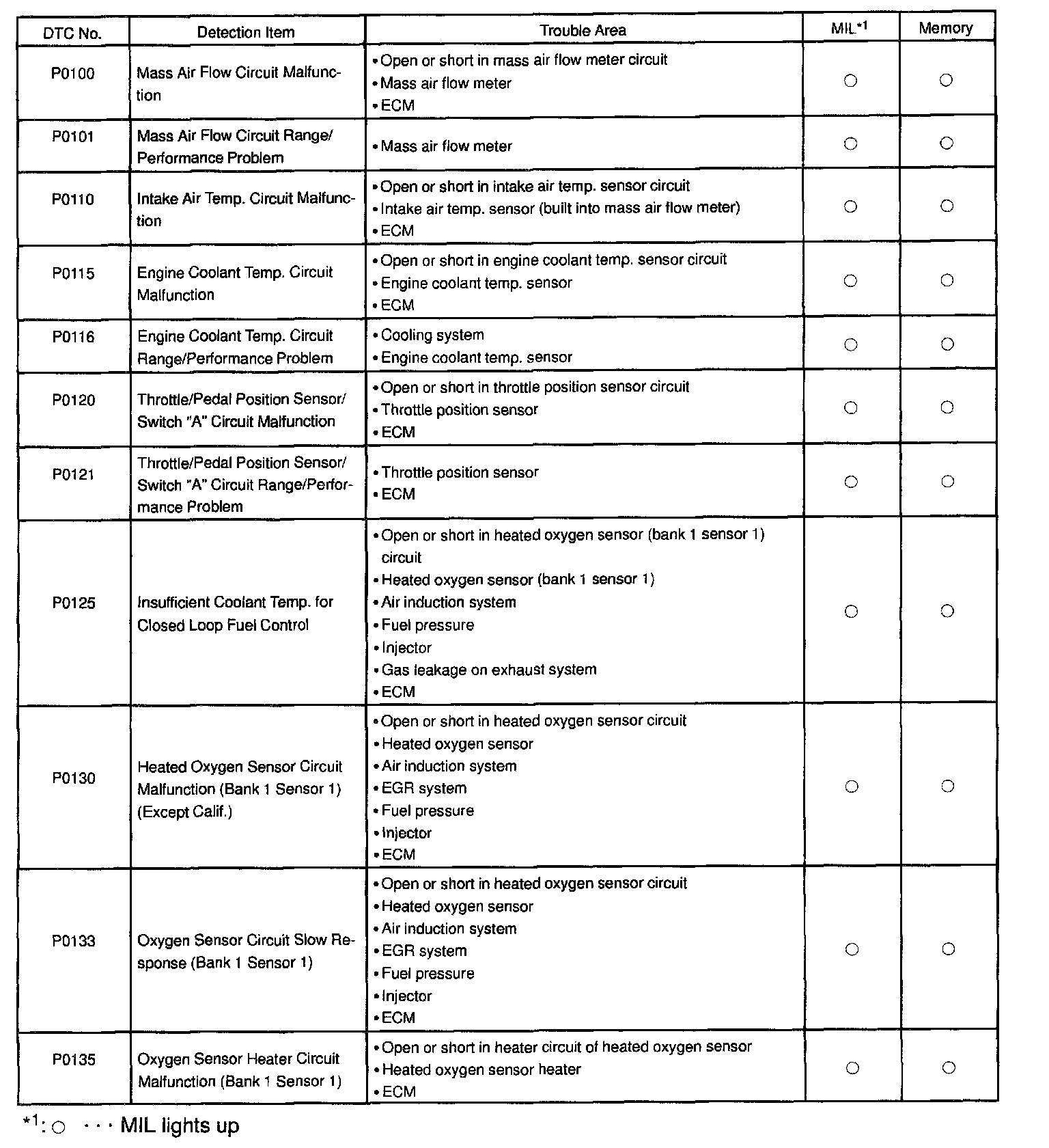 If a malfunction code is displayed during the DTC check in check mode, check the circuit for that code listed in the table. For details of each code, refer to the appropriate troubleshooting referred for the respective "DTC No." in the DTC chart.