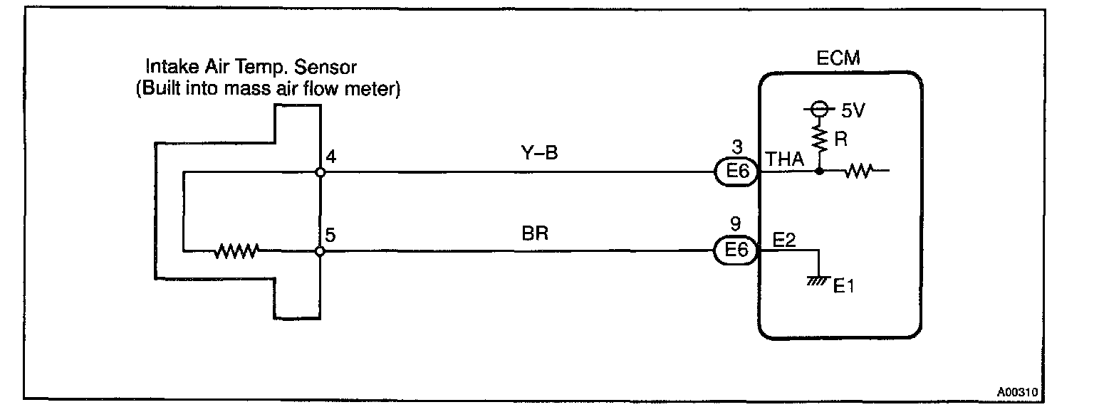 The air intake temperature sensor is connected to the ECM. The 5 V power source voltage in the ECM is applied to the intake air temperature sensor from the terminal THA via a resistor R.