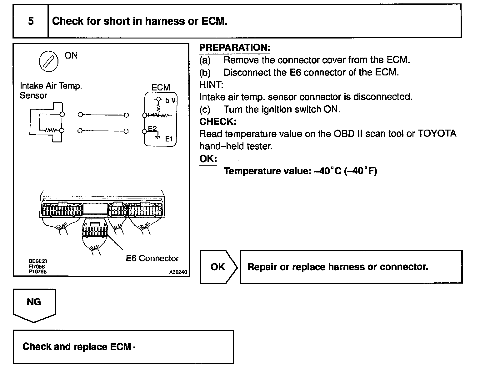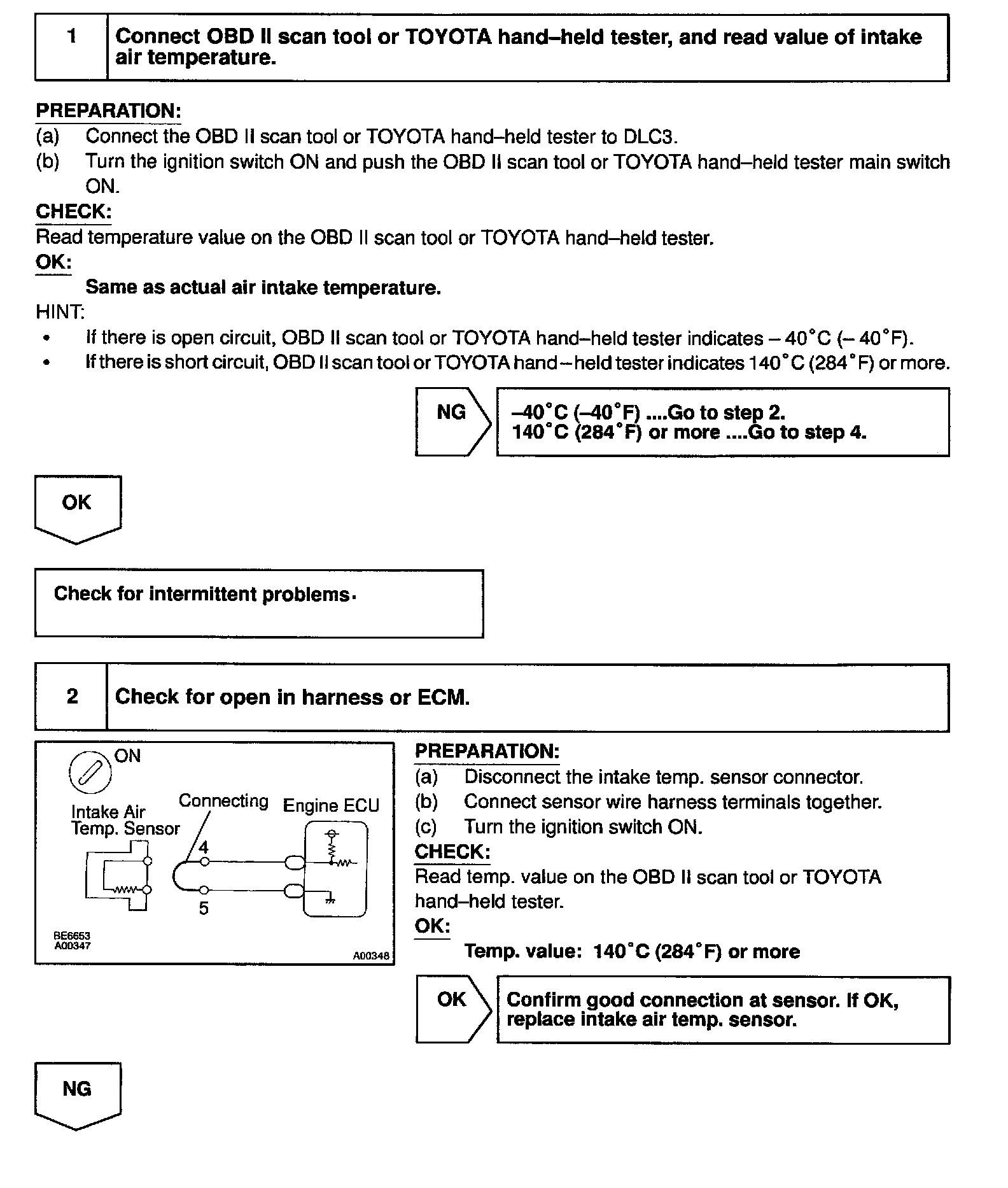 HINT: After confirming DTC P0110, use the OBD II scan tool or TOYOTA hand-held tester to confirm the intake air temperature from CURRENT DATA.