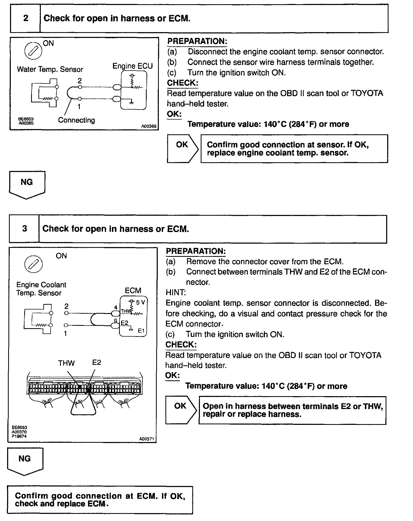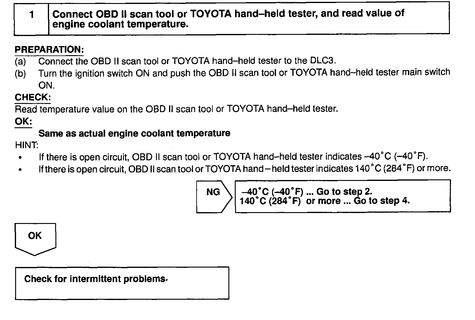 HINT: After confirming DTC P0115, use the OBD II scan tool or TOYOTA hand-held tester to confirm the engine coolant temperature from "CURRENT DATA".