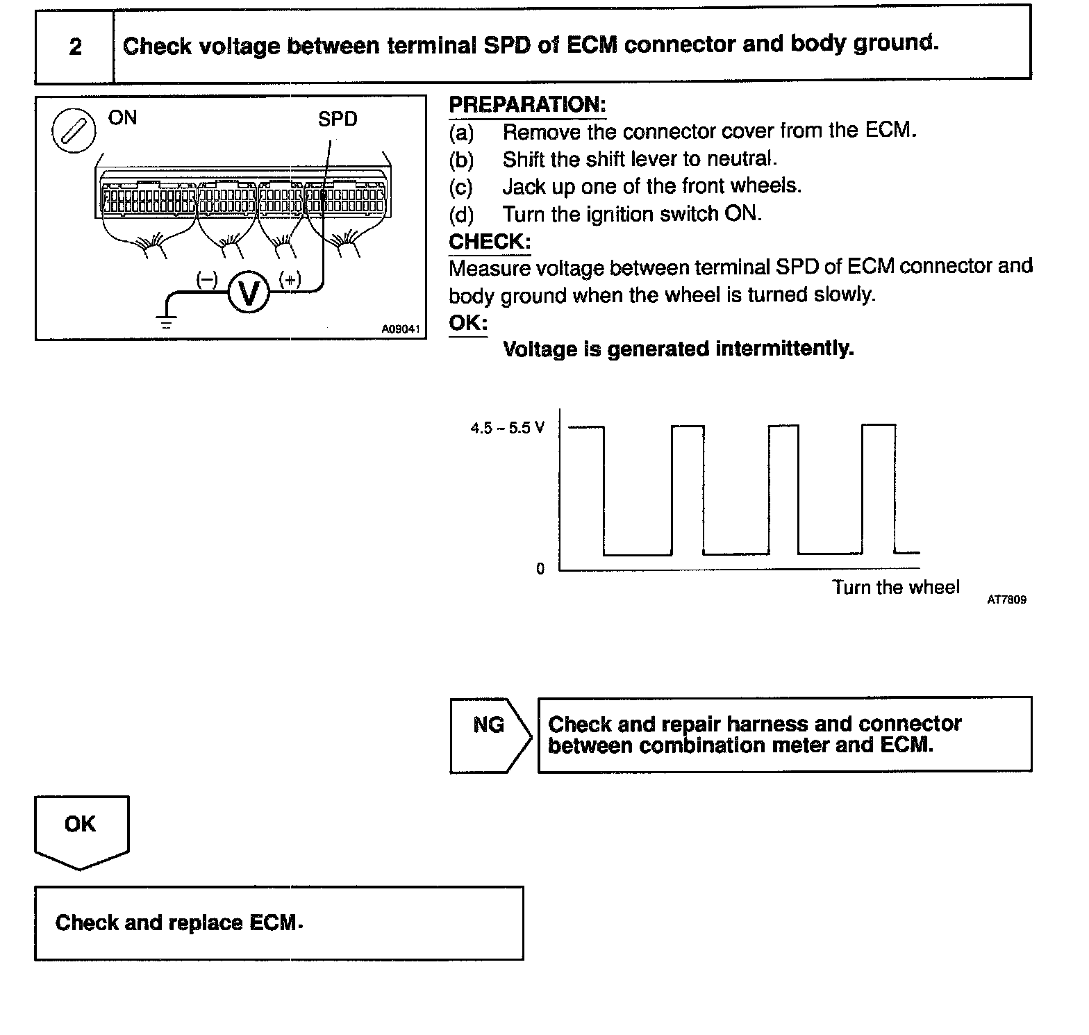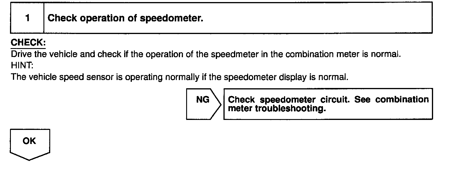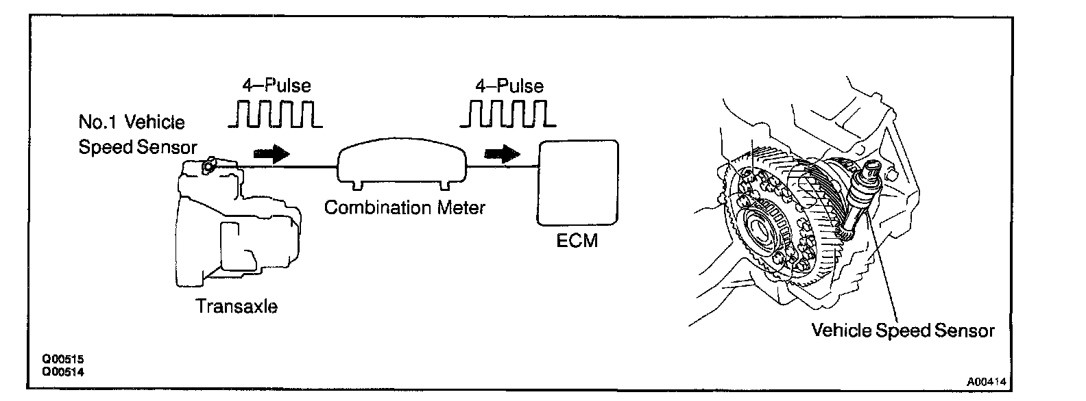 The No.1 vehicle speed sensor outputs a 4-pulse signal for every revolution of the rotor shaft, which is rotated by the transmission output shaft via the driven gear. After this signal is converted into a more precise rectangular waveform by the waveform shaping circuit inside the combination meter, it is then transmitted to the ECM. The ECM determines the vehicle speed based on the frequency of these pulse signals.