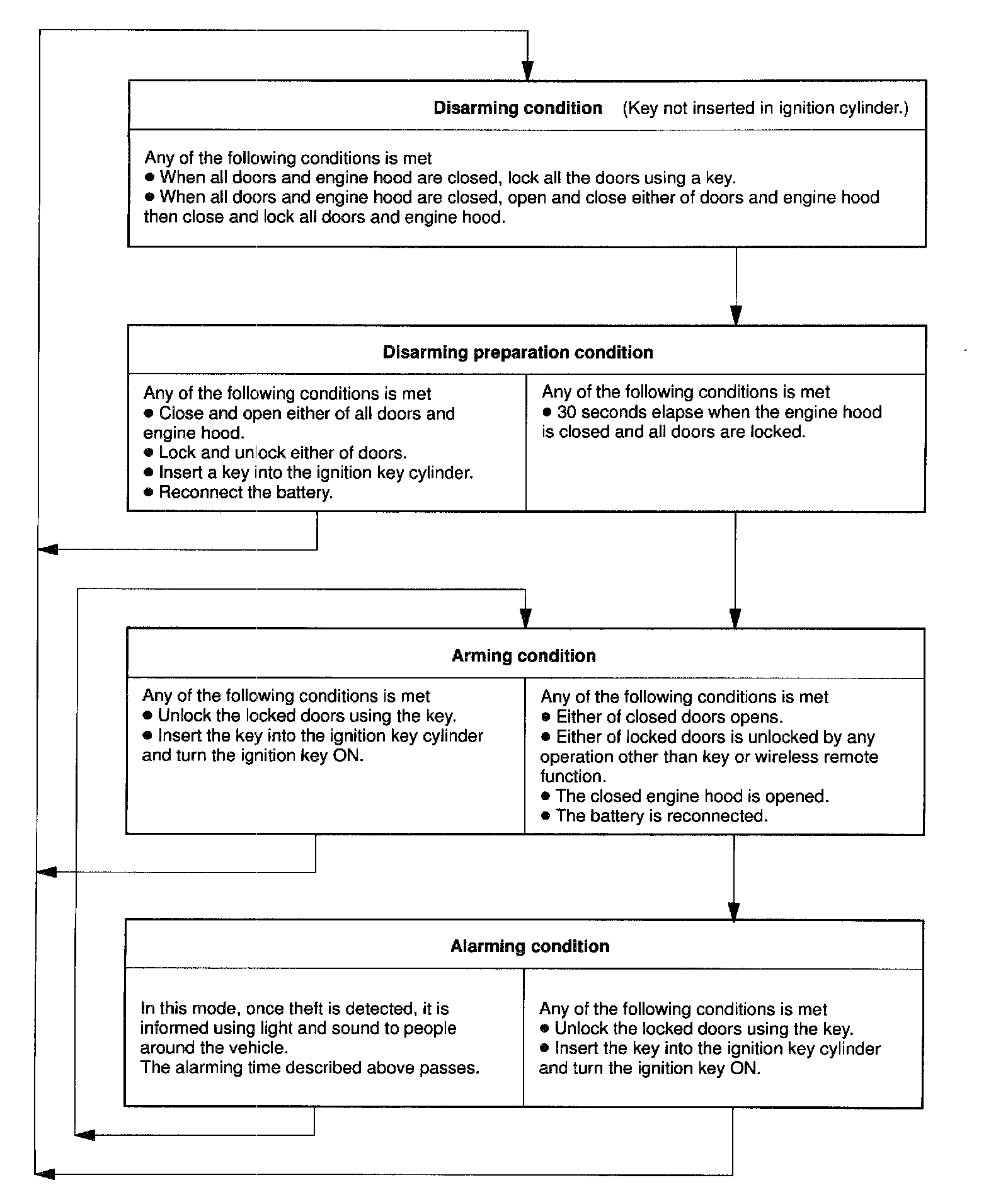 There are 4 conditions in this system which are disarmed state, arming preparation, armed state and alarm sounding.