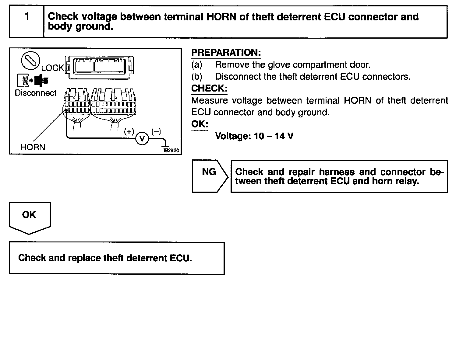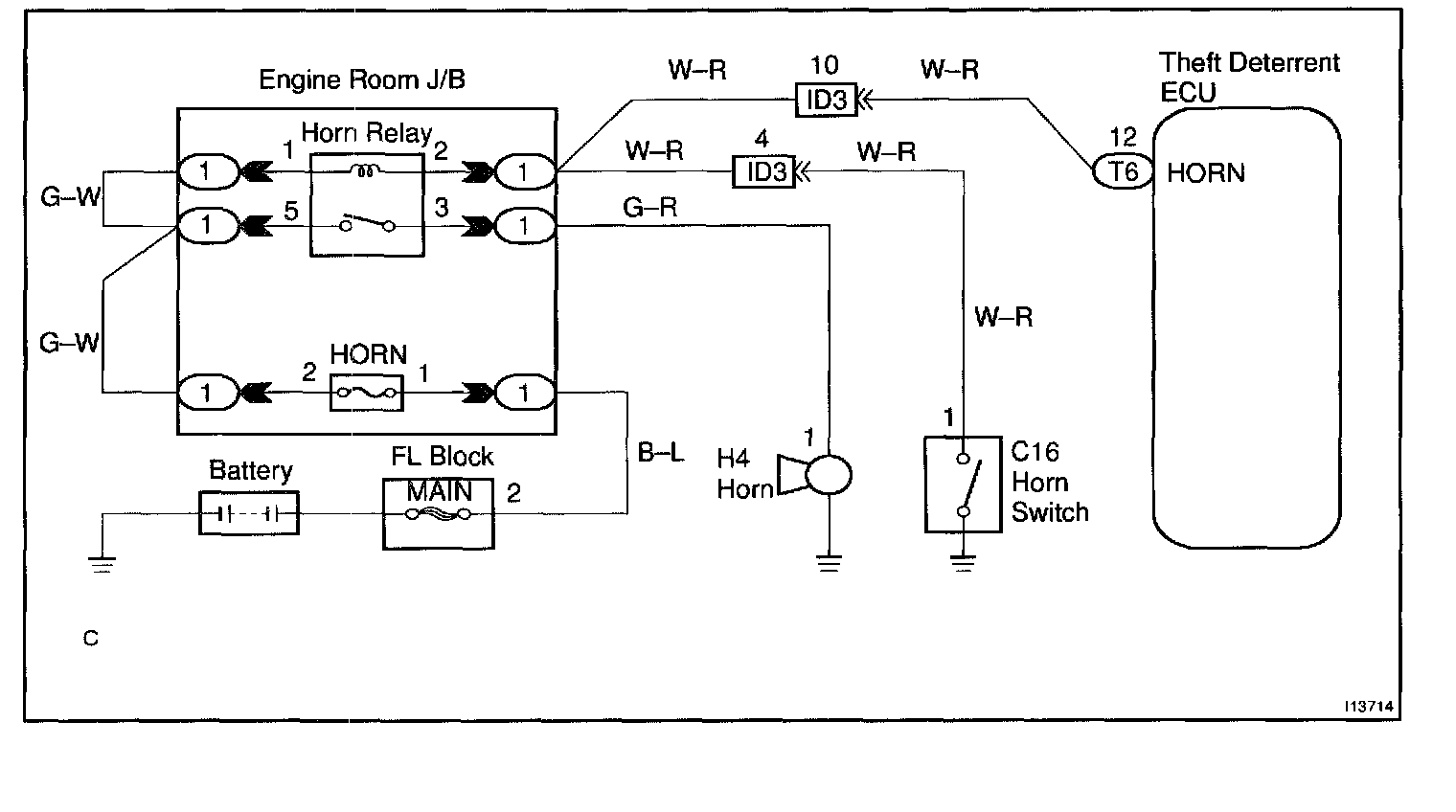 CIRCUIT DESCRIPTIONWhen the theft deterrent system is activated, it causes the Tr in the ECU to switch ON and OFF in approximately 0.4 sec. cycles. This switches the horn relay ON and OFF, thus the horns blow (See the wiring diagram).