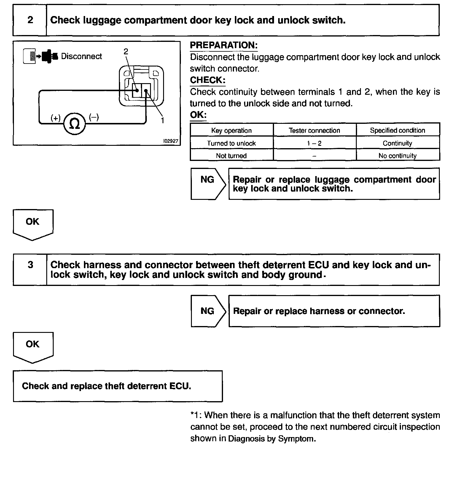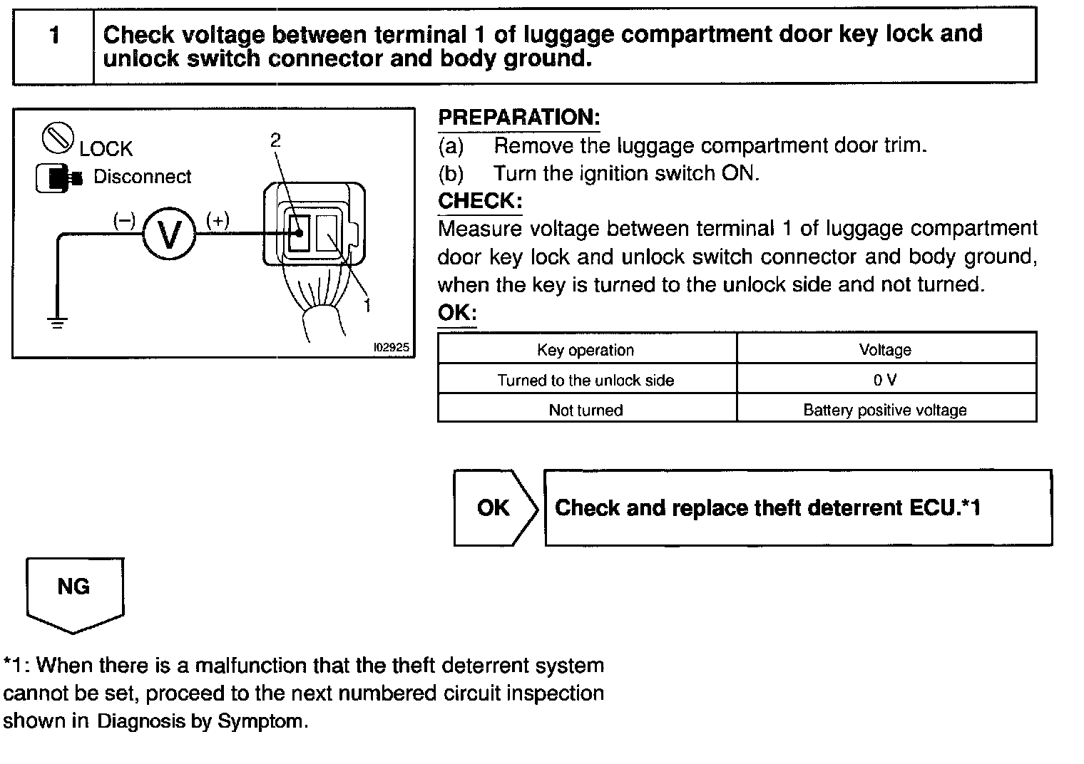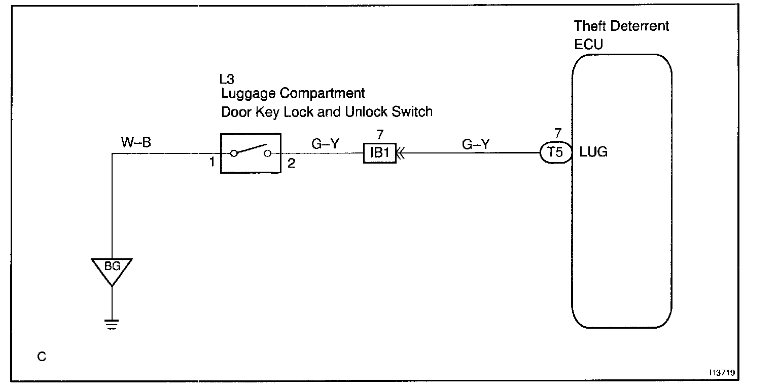 CIRCUIT DESCRIPTIONThe luggage compartment door key lock and unlock switch goes ON when the luggage compartment door key cylinder is turned to the unlock side with the key.