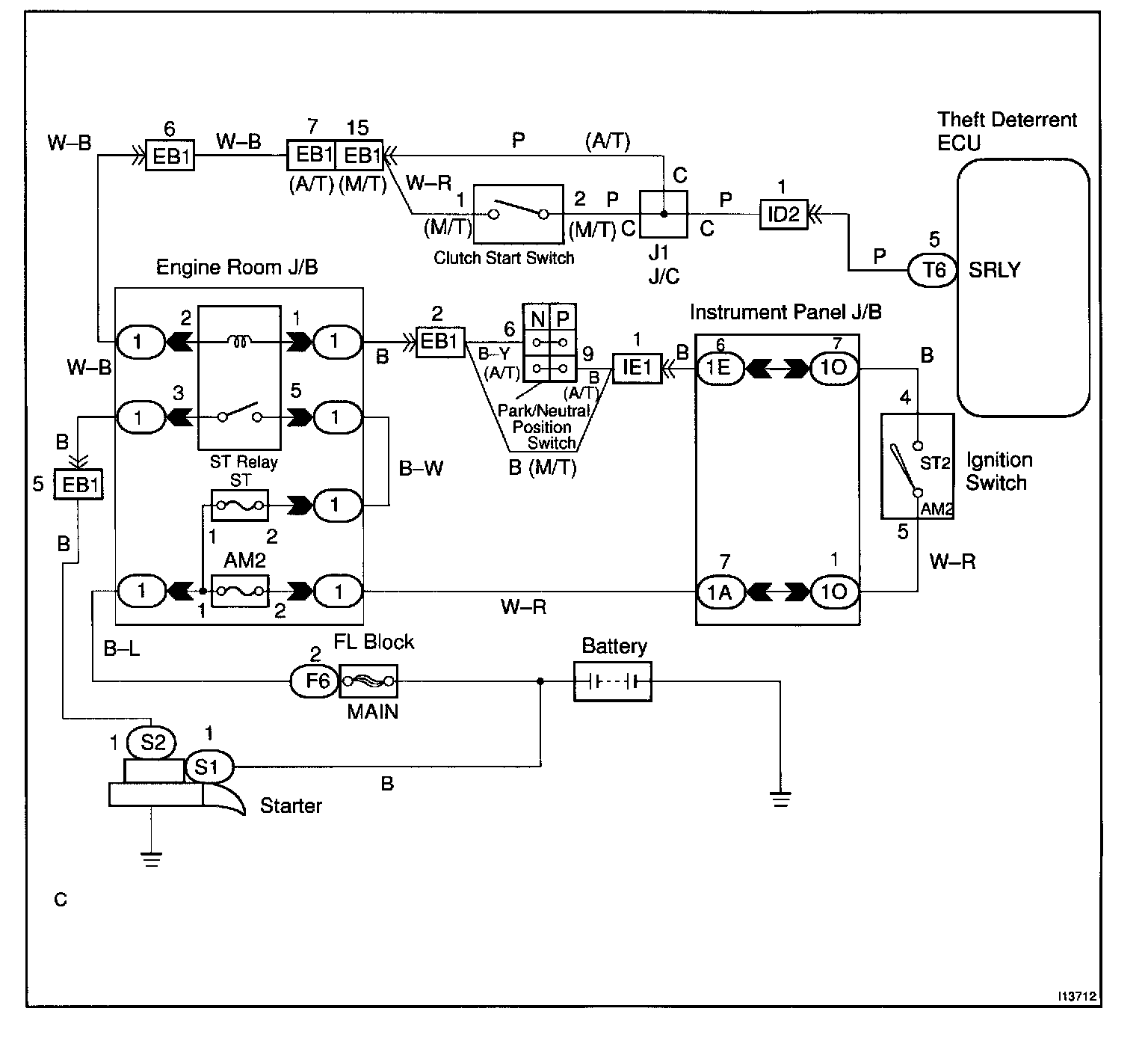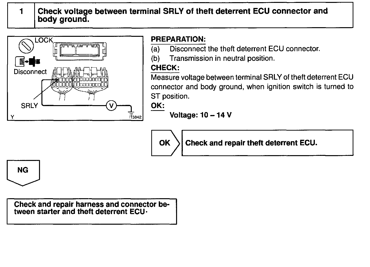 CIRCUIT DESCRIPTIONWhen the theft deterrent system is activated, contact (a) in the ECU becomes open, creating an open circuit in terminal SRLY circuit and making the starter inoperative (starter cut).