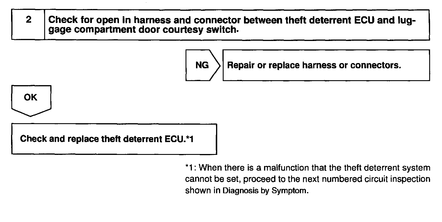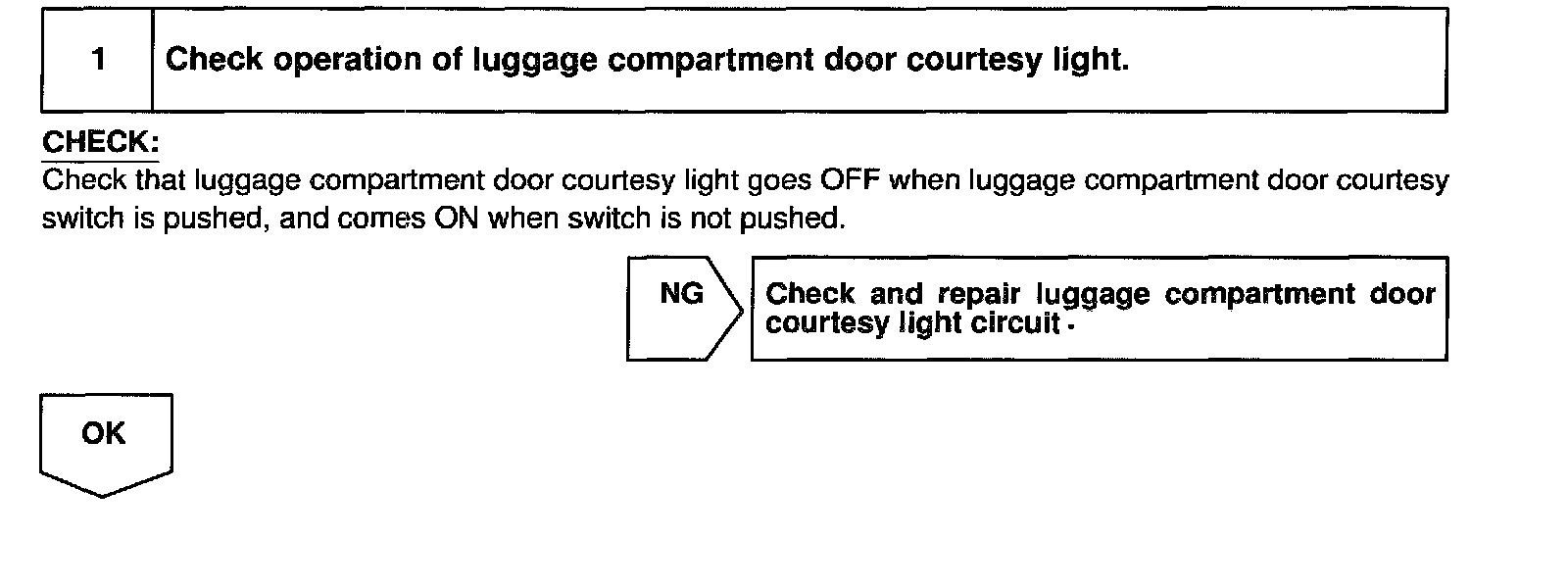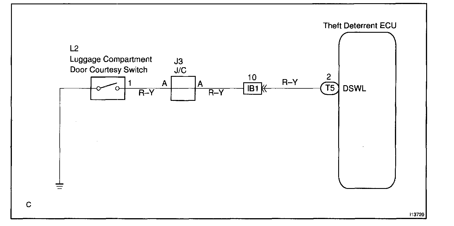 CIRCUIT DESCRIPTIONThe luggage compartment door courtesy switch goes ON when luggage compartment door is opened and goes OFF when the luggage compartment door is closed.
