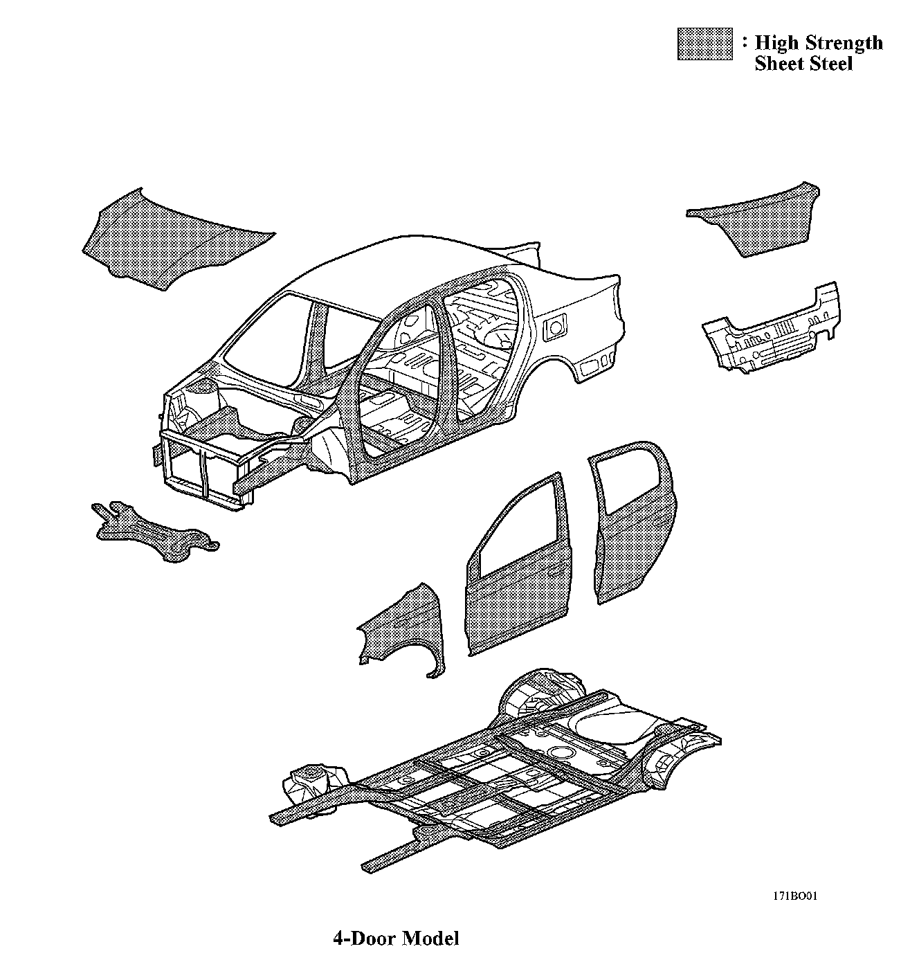 High strength sheet steel is used for the hood, fender, door panels, luggage compartment panel, and members. We tried to lighten the weight by increasing the use of high strength sheet steel sections.