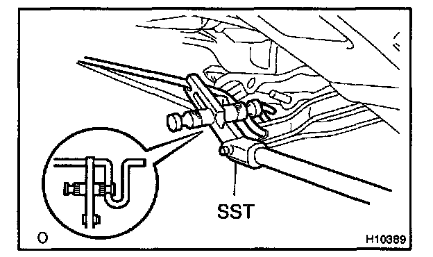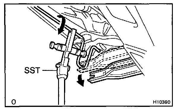 d. Slowly lift SST, and remove the torsion bar from the torsion bar bracket with SST.