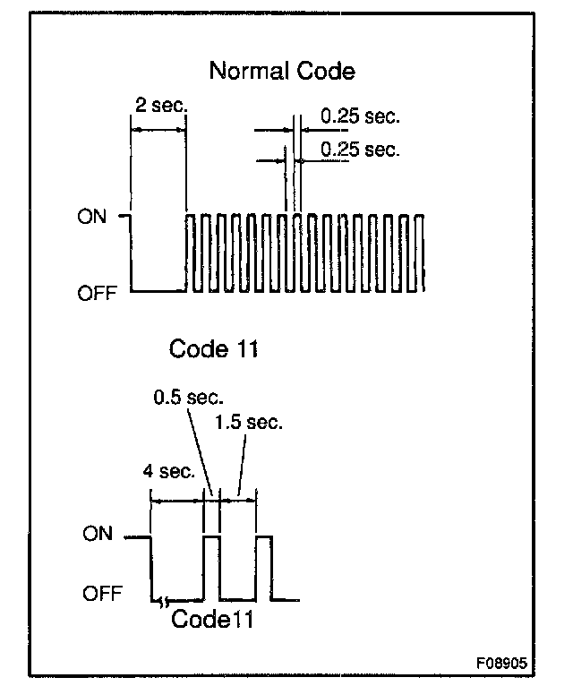 - As an example, the blinking patterns for normal code and codes 11 are shown on the left.