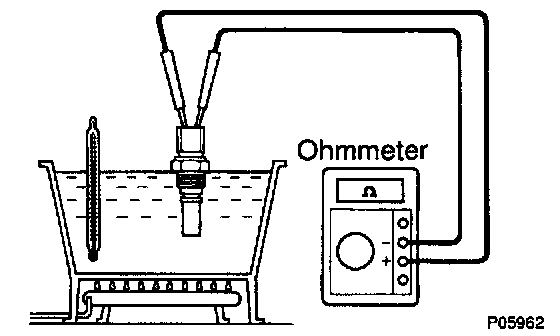 a. Using an ohmmeter, check that there is no continuity between the terminals when the coolant temperature is above 93°C (199°F). If there is continuity, replace the switch.