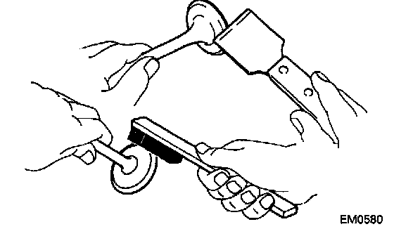 b. Check the valve seating position. Apply a light coat of Prussian blue (or white lead) to the valve face. Lightly press the valve against the seat. Do not rotate valve.