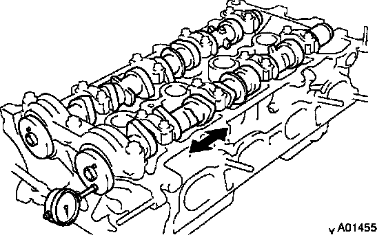 b. Using a dial indicator, measure the thrust clearance while moving the camshaft back and forth.