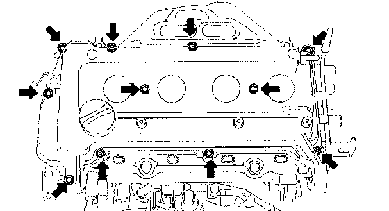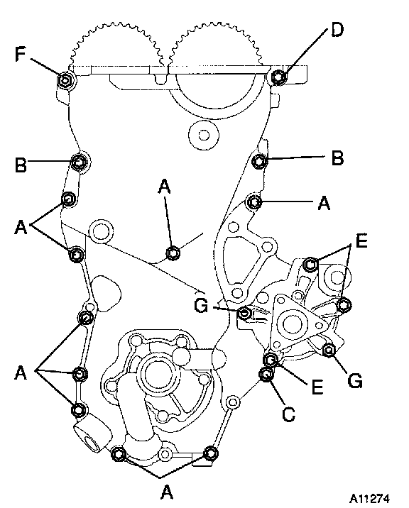 e. Install the timing chain cover, new O-ring and water pump with the 16 bolts and 3 nuts. Uniformly tighten the bolts and nut in several passes.