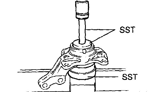 b. Using SST and a press, remove the bearing from the steering knuckle.