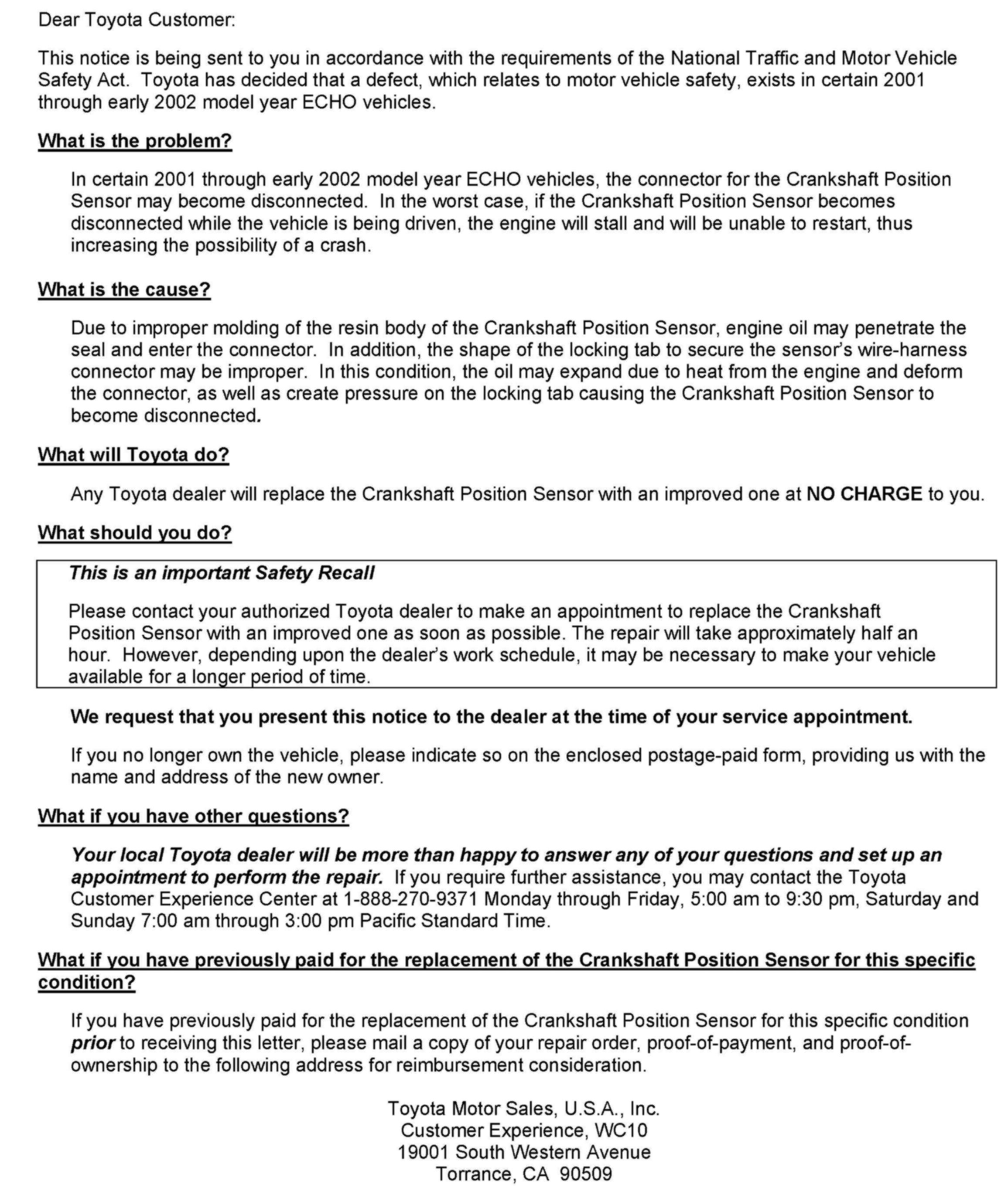 Recall - Crankshaft Position Sensor Replacement