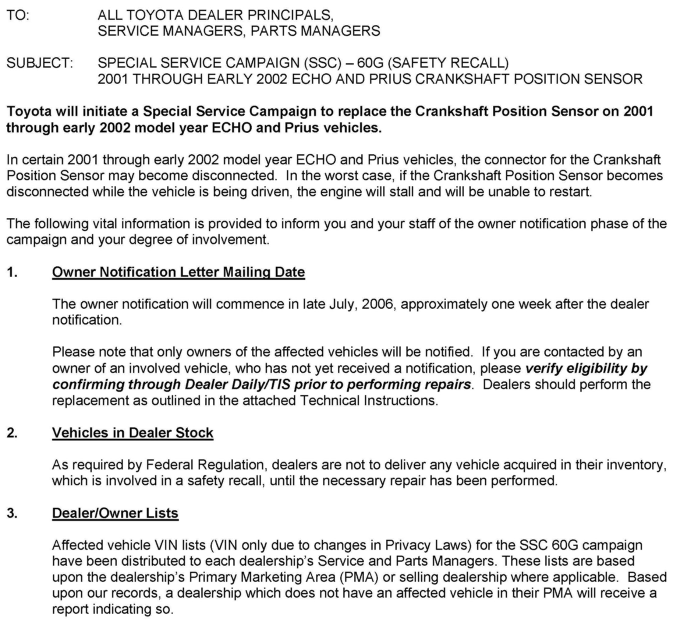 Recall - Crankshaft Position Sensor Replacement