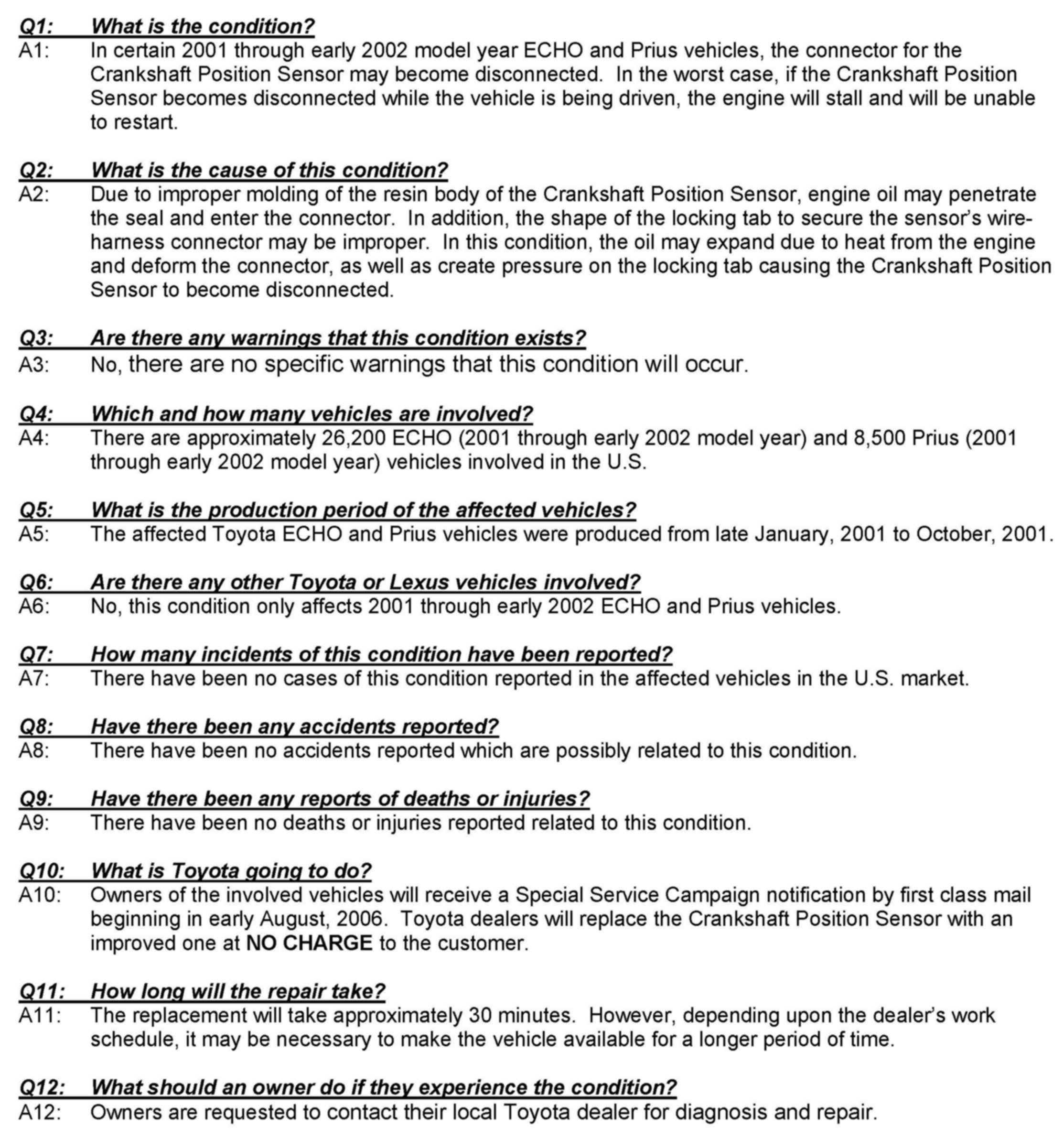 Recall - Crankshaft Position Sensor Replacement
