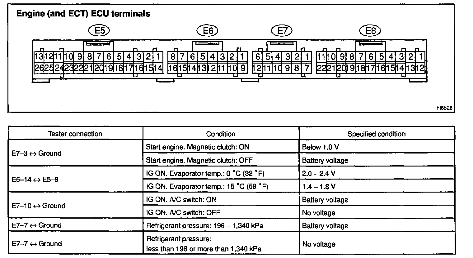 Inspect the wire harness side connector of engine (and ECT) ECU from the back side, as shown in the chart.