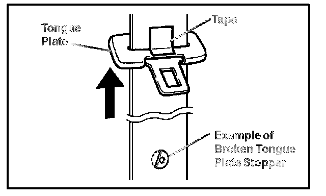D. Check to be sure that the male pin of the tongue plate stopper has become deformed evenly in the hole of the female part and is firmly held to the belt webbing.