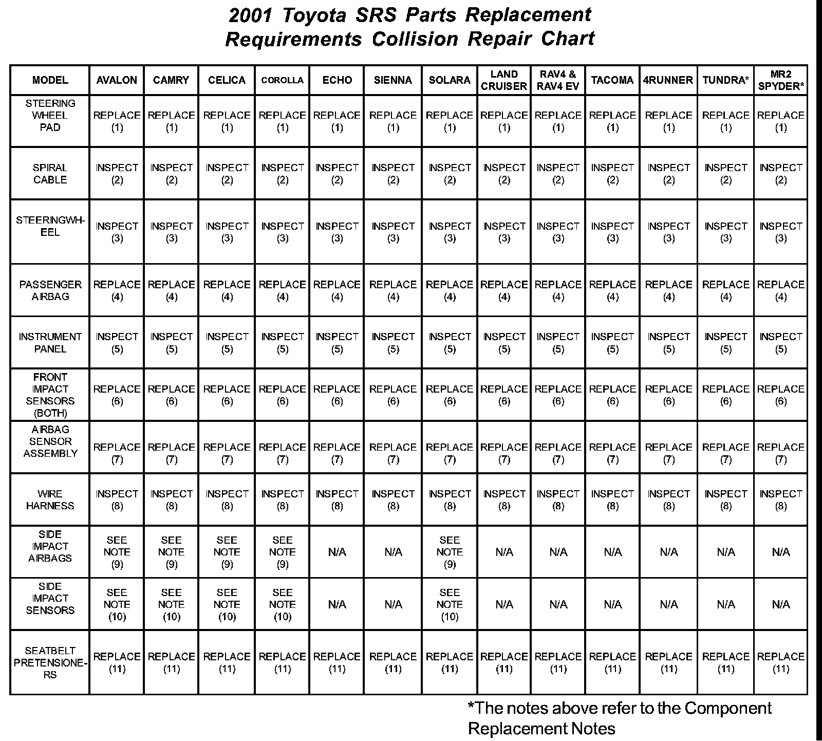 In order to assure correct system operation it is necessary to replace certain components of the airbag system following a collision. In order to assist technicians in determining which components should be inspected tested or replaced the repair manual information has been organized in the attached matrix and replacement notes.