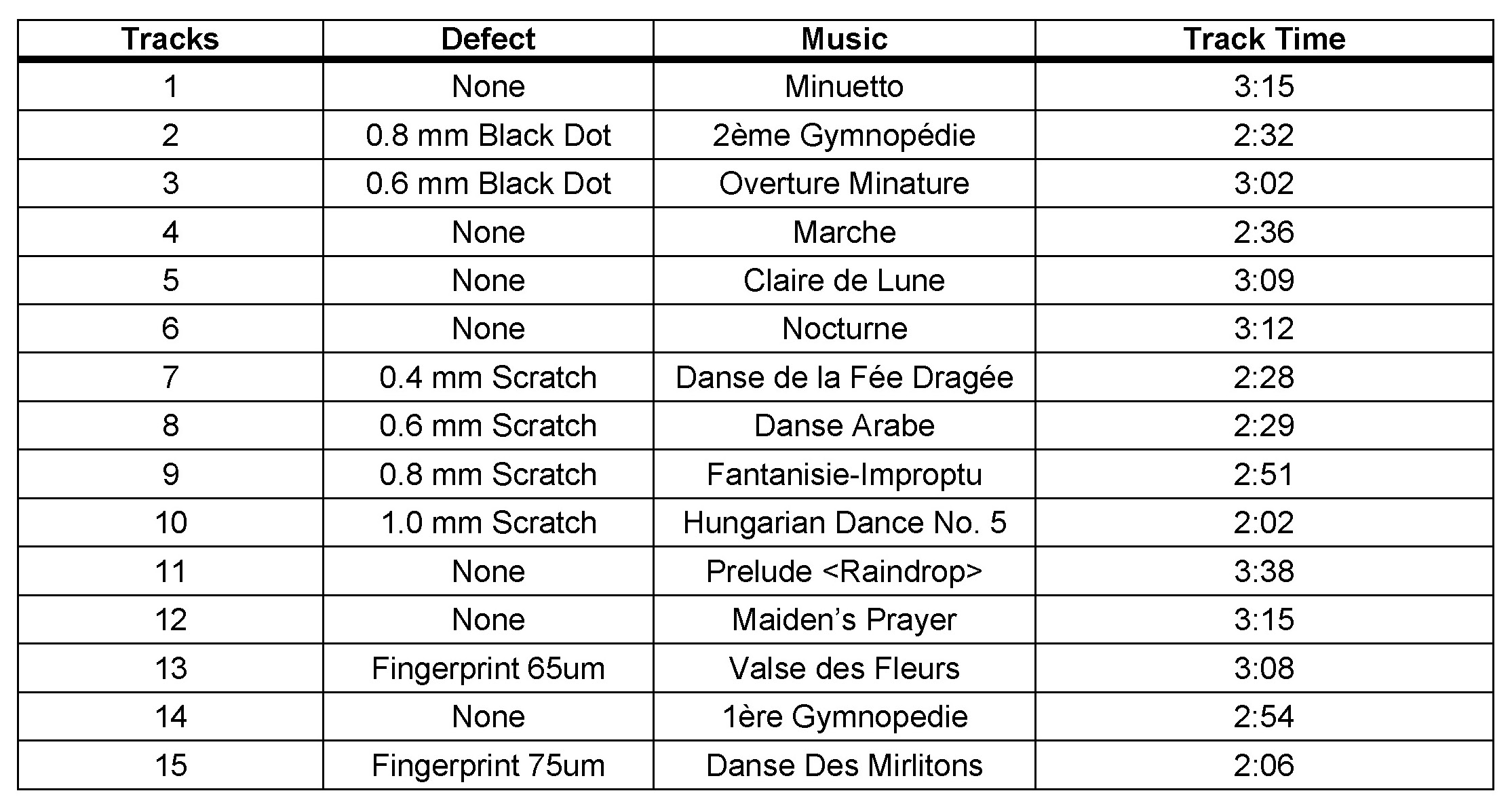 - Tracks 1 -- 8 and 11 -- 14 are reference tracks. They can be used, but the conditions are less severe than track 9. Do NOT use track 10 and 15.