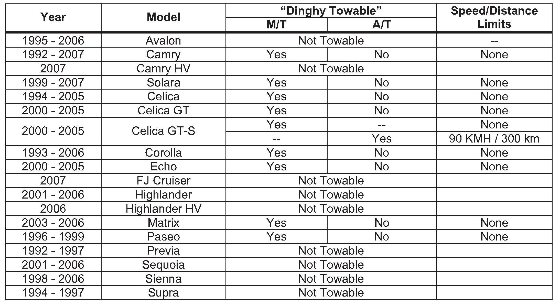 The following chart indicates which Toyota vehicles can be Flat (Dinghy) Towed (towed with four wheels on the ground) behind a motor-home.