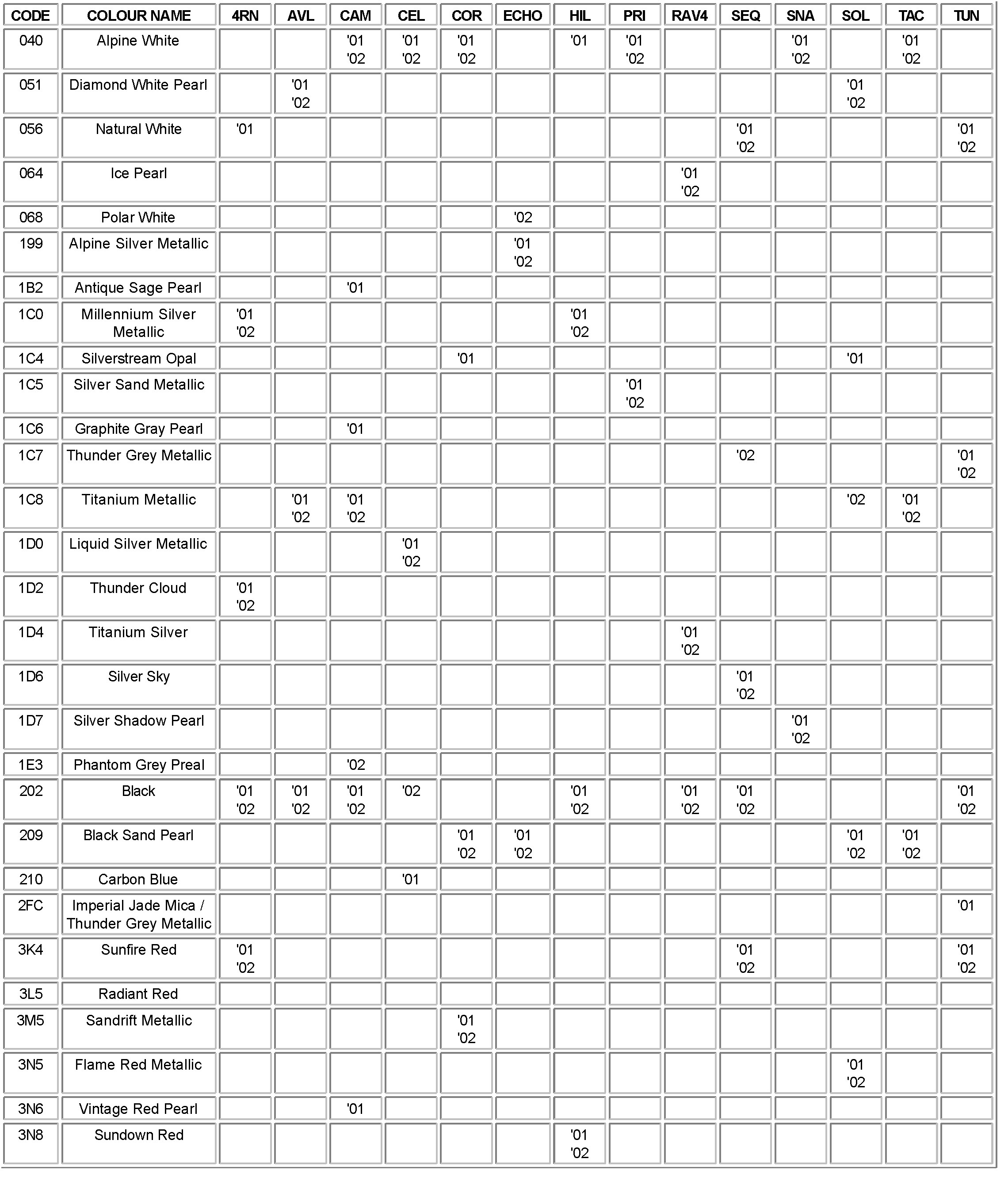 Attached, for your reference, is a list of OEM paint codes for all 2001 - 2002 model year vehicles.