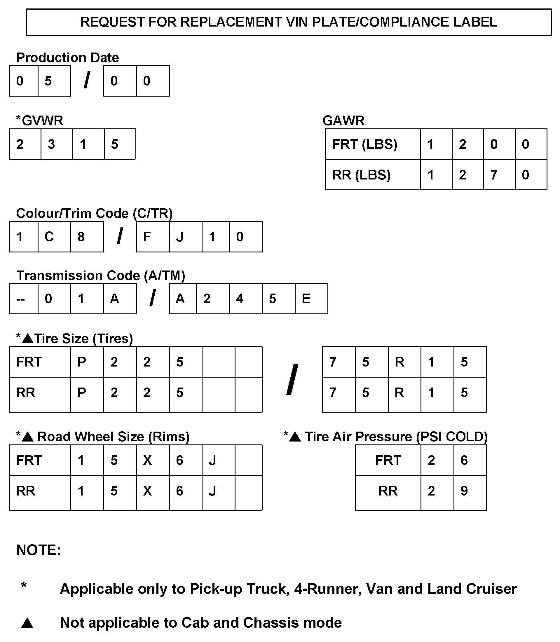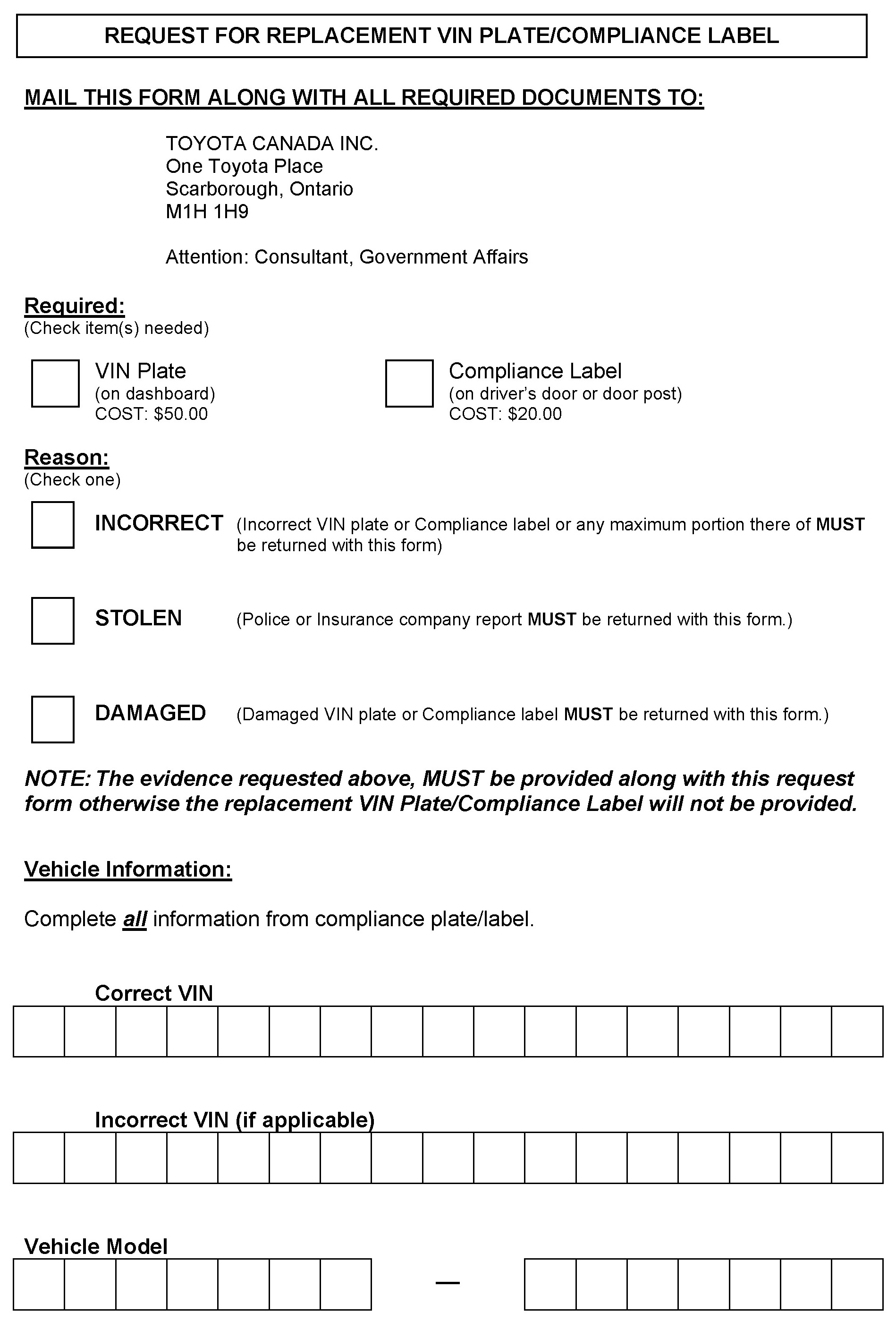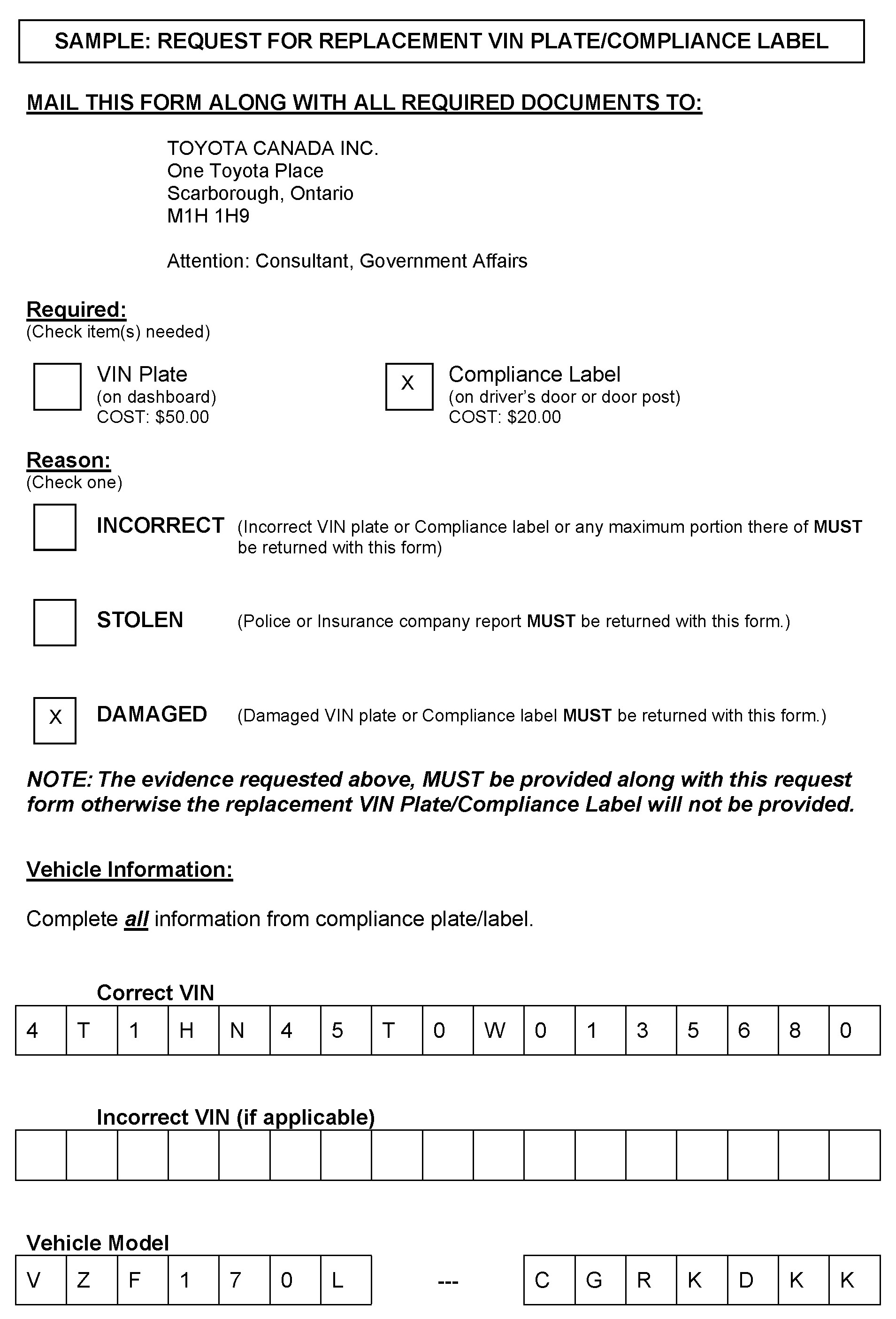 - Sample "Request For Replacement VIN Plate/Compliance Label" form. (Attachment A)