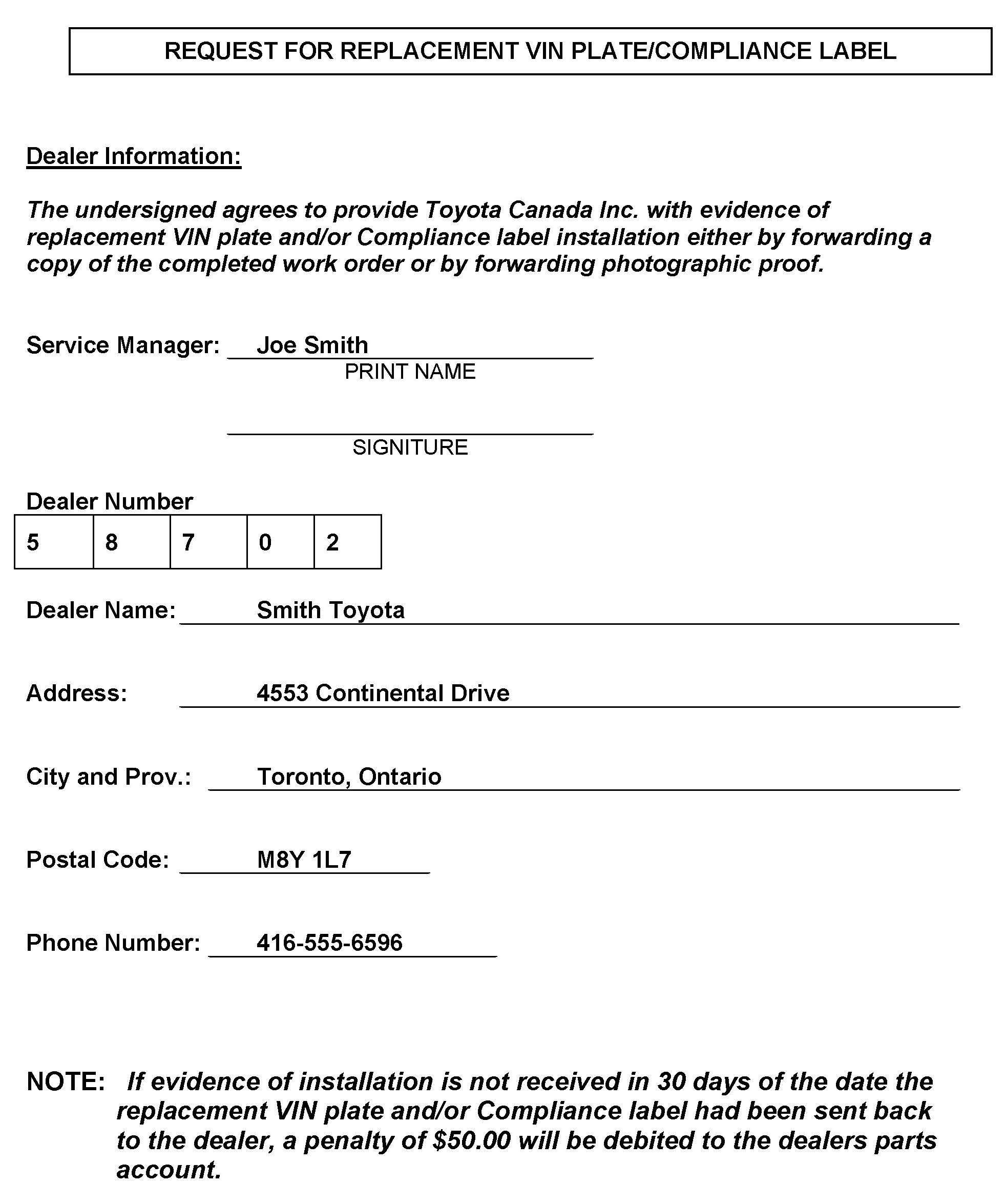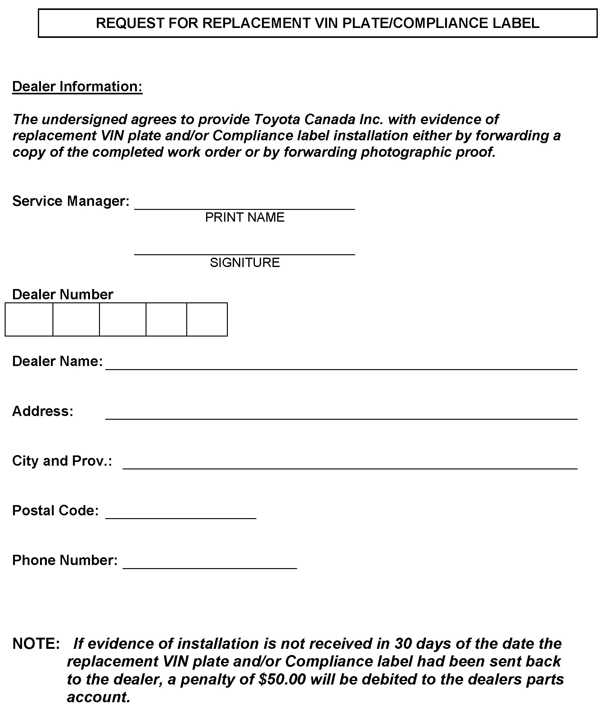 In order for a request to be processed the Service Manager must sign and submit the "Request For Replacement VIN Plate/Compliance Label" form (Attachment B).