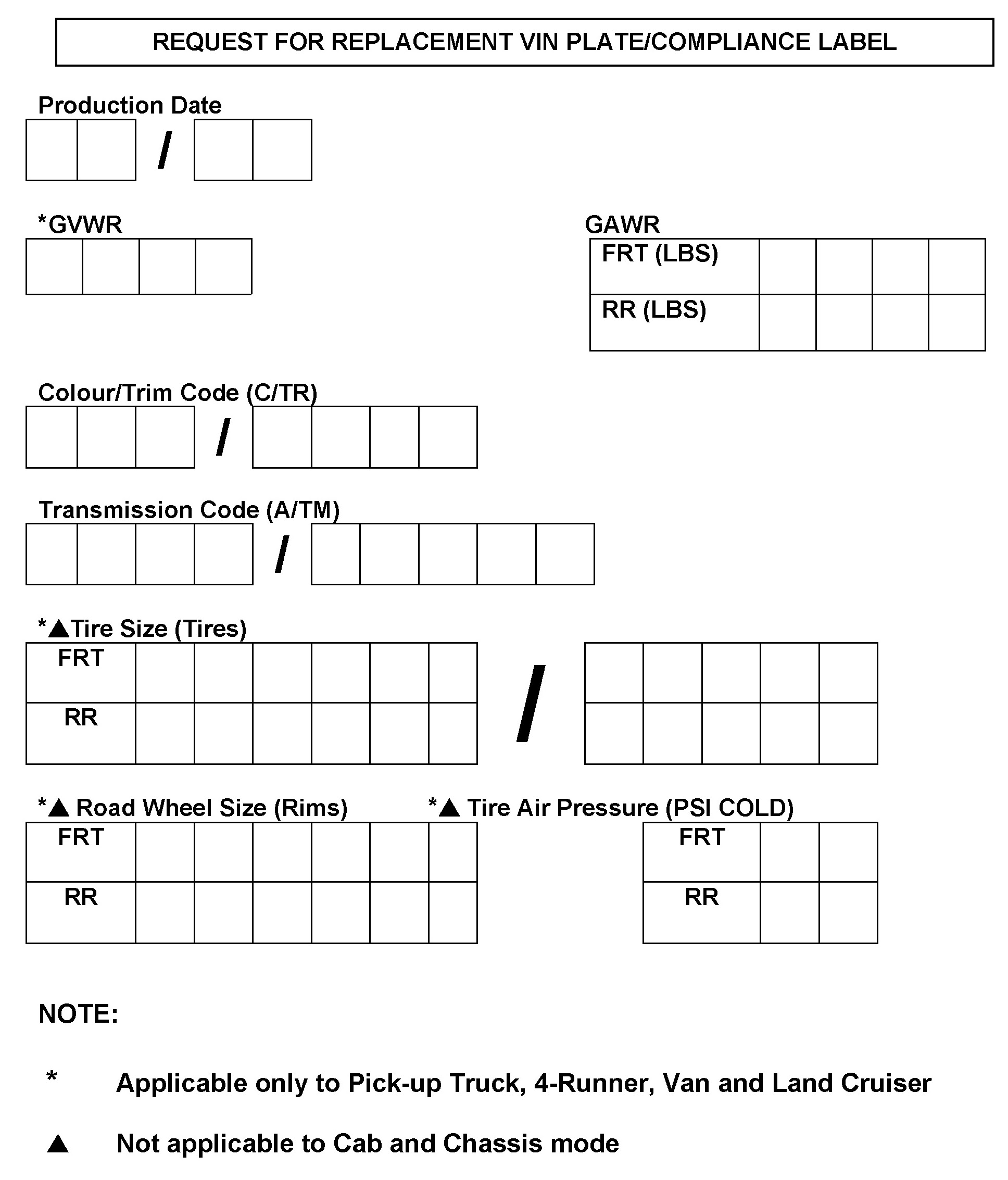 - The original VIN plate or Compliance label has been stolen or removed by the police. (Be sure to contact the Police first). When requesting a new plate or label to replace a stolen one, a copy of the police or insurance company report must be included with the request.