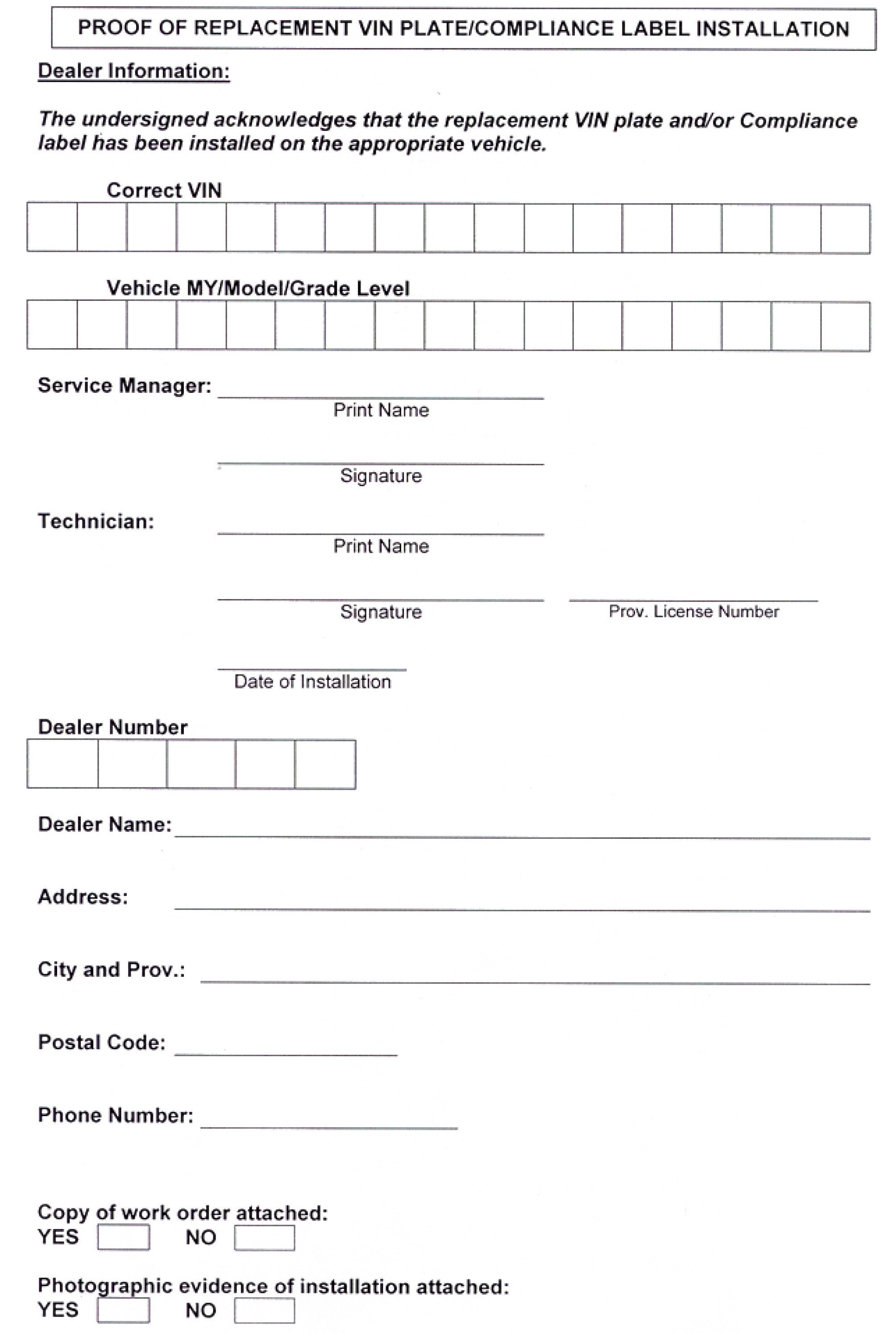 9. Photocopy the completed "Proof of Replacement VIN Plate/ Compliance Label Installation" form for your dealer customer file; and,