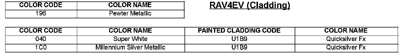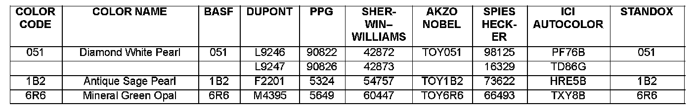 Attached for your reference is a list of all 2001 Toyota paint codes and the refinish formula codes for the following paint manufacturers: