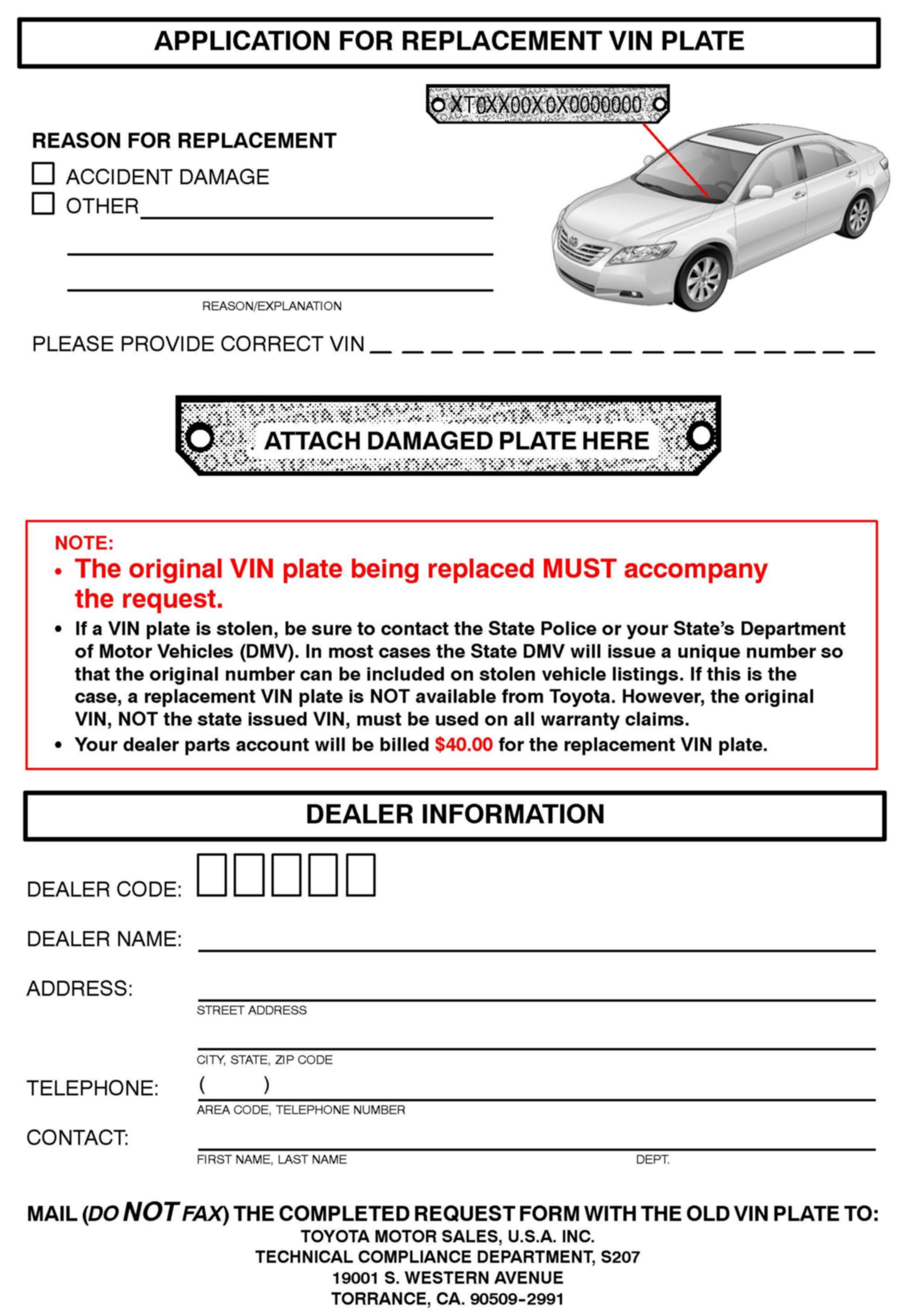 To request a replacement VIN plate, complete a copy of the form at the end of this bulletin. Note that the damaged VIN plate MUST accompany the request form. Your dealer parts account will be billed $40.00 for each replacement of a damaged VIN plate.